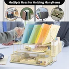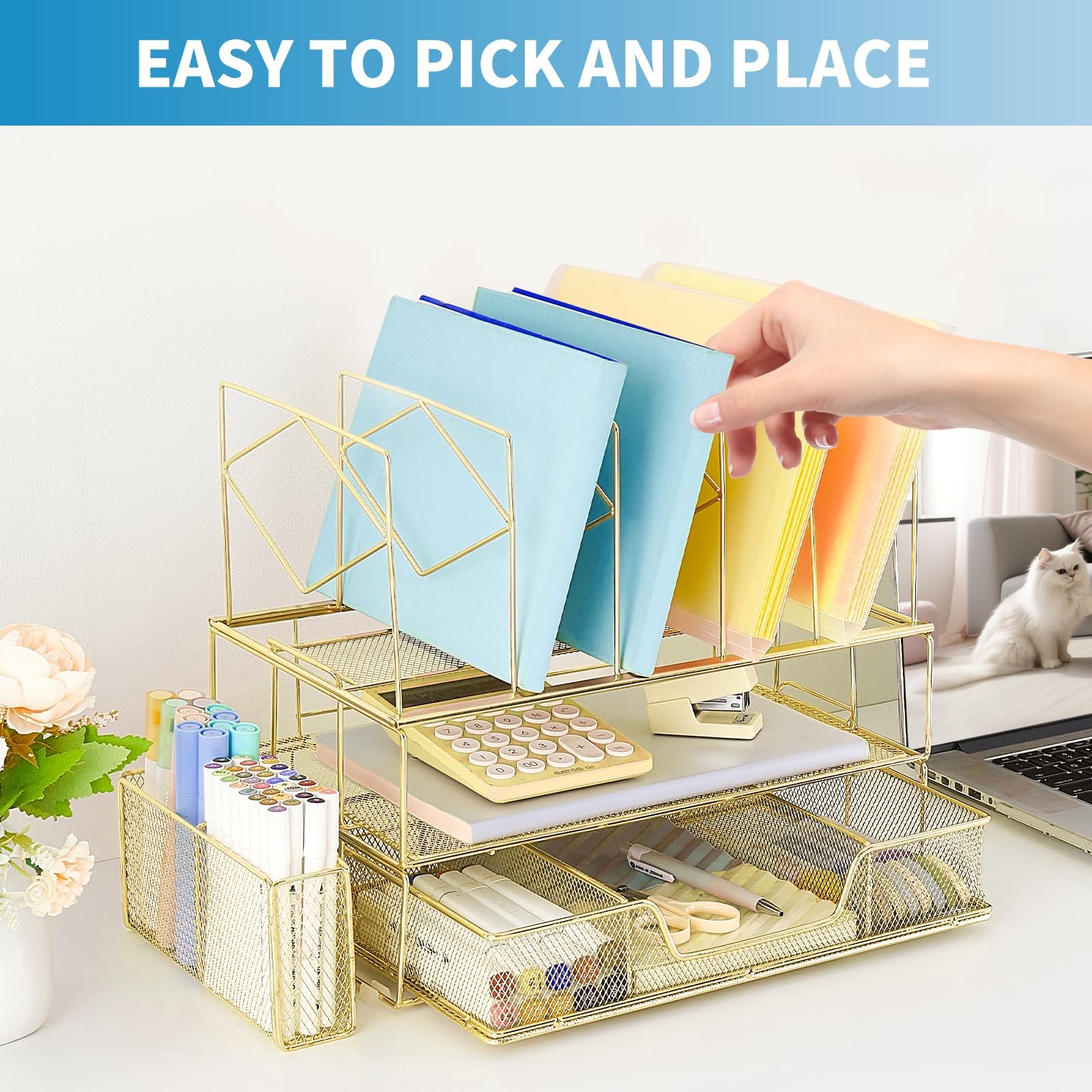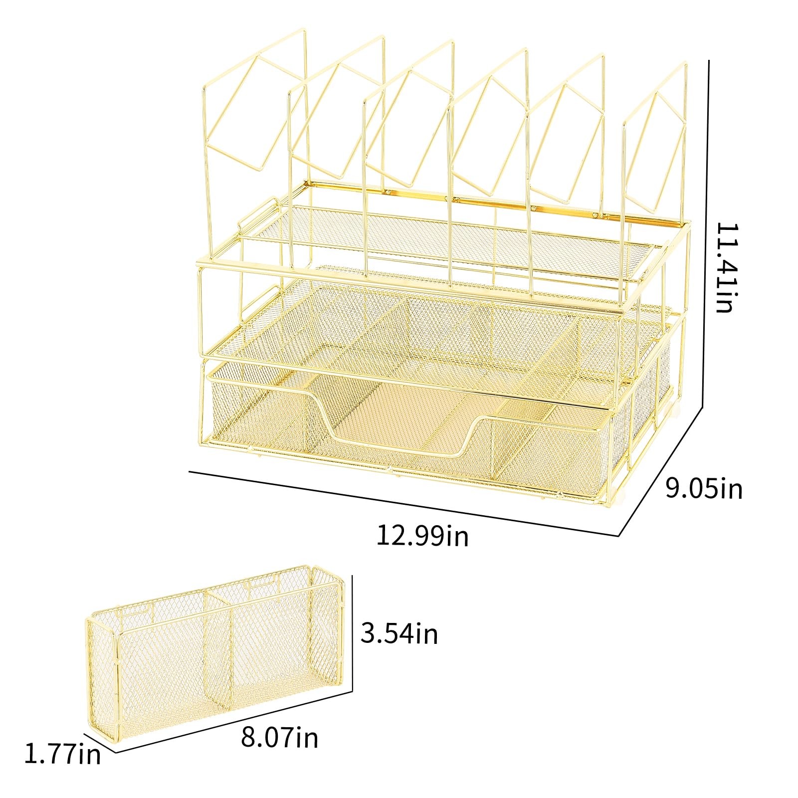 Perfect Office Desk Organizers and Accessories: ①Paper Tray: Use a flat tray to store notebooks, scissors, and staplers. ②Sliding Large Drawer: Pull-out drawers provide useful space for small items, ideal for storing small accessories such as glue sticks, paper clips, rubber bands and sticky notes, and within reach. ③ Upright file folder rack sorters: keep letters, magazines, bills, documents organized and easily accessible, or remove the top vertical sorter, if preferred. ④4 rubber bottoms to ensure no slippage. The desk storage would not slide anymore while pulling out the drawers. ⑤Size: 12.9L x 9W x 12.6H in. This desktop office file organizer will be used to store your school books and whatever supplies necessary! 【CREATIVE DESK ORGANIZER】Multifunctional desktop file organizer has vertical and horizontal storage space. Upright section has five 2.5" Compartments for folders, magazines, bill, file, book. Different types of use to meet your various office needs! 【SUPER EASY TO ASSEMBLE】No need for any tools. Assembly in 2 minutes. The upgraded buckle design makes storage easy. Easy to move and use. 【MODERN DESIGN】Made of metal materials, Strong and durable. The desk organizers and accessories has 4 rubber bottoms to ensure no slippage. The office organization would not slide anymore while pulling out the drawers. Great for your workspace, cubicle, dorm or any room! 【STAY ORGANIZED】The office organizer with file holders and drawer provide enough space for different desk stationery. Large capacity enough to sorted storage for all your office supplies. Save your space. 【HAPPY PURCHASE】Great for teachers, students, workers, office staff in the school, home or office. If you have any problem with our products, please contact us and we'll help to solve it in 24 hours.