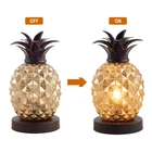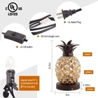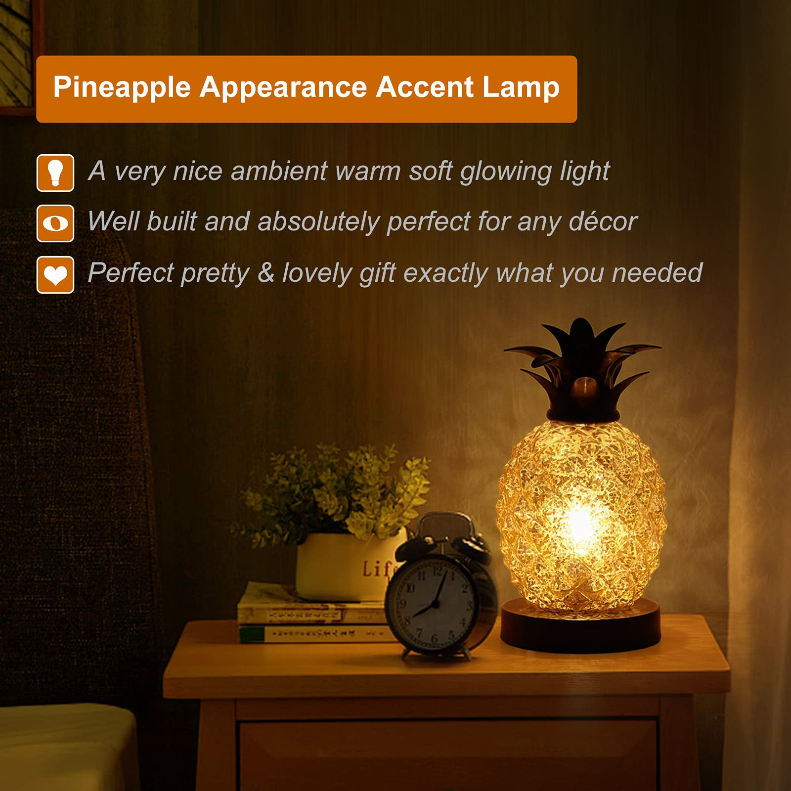 Mercury Golden Glass Pineapple Lamps with 2 Bulbs Product Features: 1.The pineapple light has golden diamond pattern glass shade and antique stable bronze finish metal top and base, same size with real pineapple. 2.This mercury glass pineapple table lamp has soft warm ambient glow at night, creating a comfortable, pleasant and sweet atmosphere for you. 3.On/Off switch is located in the middle of the cord. The cord, switch, socket and plug are UL listed. It is convenient and safe to use. 4.It can be used as table lamp or night light in bedroom, living room, study, baby room, guest room, bathroom, kitchen countertop, office, side table or parties. It is also a great gift for your family and friends. Specifications: Shape: Pineapple Product Type: Corded table lamp Material: Metal base and top, mercury glass Lamp Size: 5x5x9.5 inches Lamp Weight: 1.5 pounds Wattage: 7W Voltage: 110V Cord Length: 60 inches Package Lists: 1 x Pineapple Light 1 x Installation Instruction 2 x E12 Incandescent Bulbs 1. UNIQUE TROPICAL PINEAPPLE DESIGN The pineapple lamp combines traditional decor style with a touch of the Hawaii tropics. Just use the same size as a real pineapple with beautiful golden diamond pattern glass shade. Perfect decoration in daytime, and so warm glow ambient at night 2.PERFECT DECORATION OF YOUR HOME Well built pineapple appearance with golden diamond pattern glass shade and antique bronze finish metal top and base, makes a warm ambient glow at night in bedroom, living room, guest room, bathroom, kitchen countertop, or desk, also a nice cute little accent lamp even in the daytime. 3.FREQUENTLY CONCERNS It includes 2 free bulbs, just regular sized E12 bulb, not special, easy to obtain; Lightweight but not cheap-feeling ; Stable structure and well-packed to decrease break risk in transit 4.PRODUCT SPEC Total Dimension: 5 x 5 x 9.5 inches; Weight: 1.5 pounds. The cord, switch, socket and plug are UL listed. Bulb Size: regular E12 incandescent bulb, easy to replace, also including 2 free bulbs inside. An on/off switch with 60 inches length cord to control. Top and bottom is metal in antique bronze finish, lamp shade is glass, strong buckle up construction together with glued, no need installation, can use directly