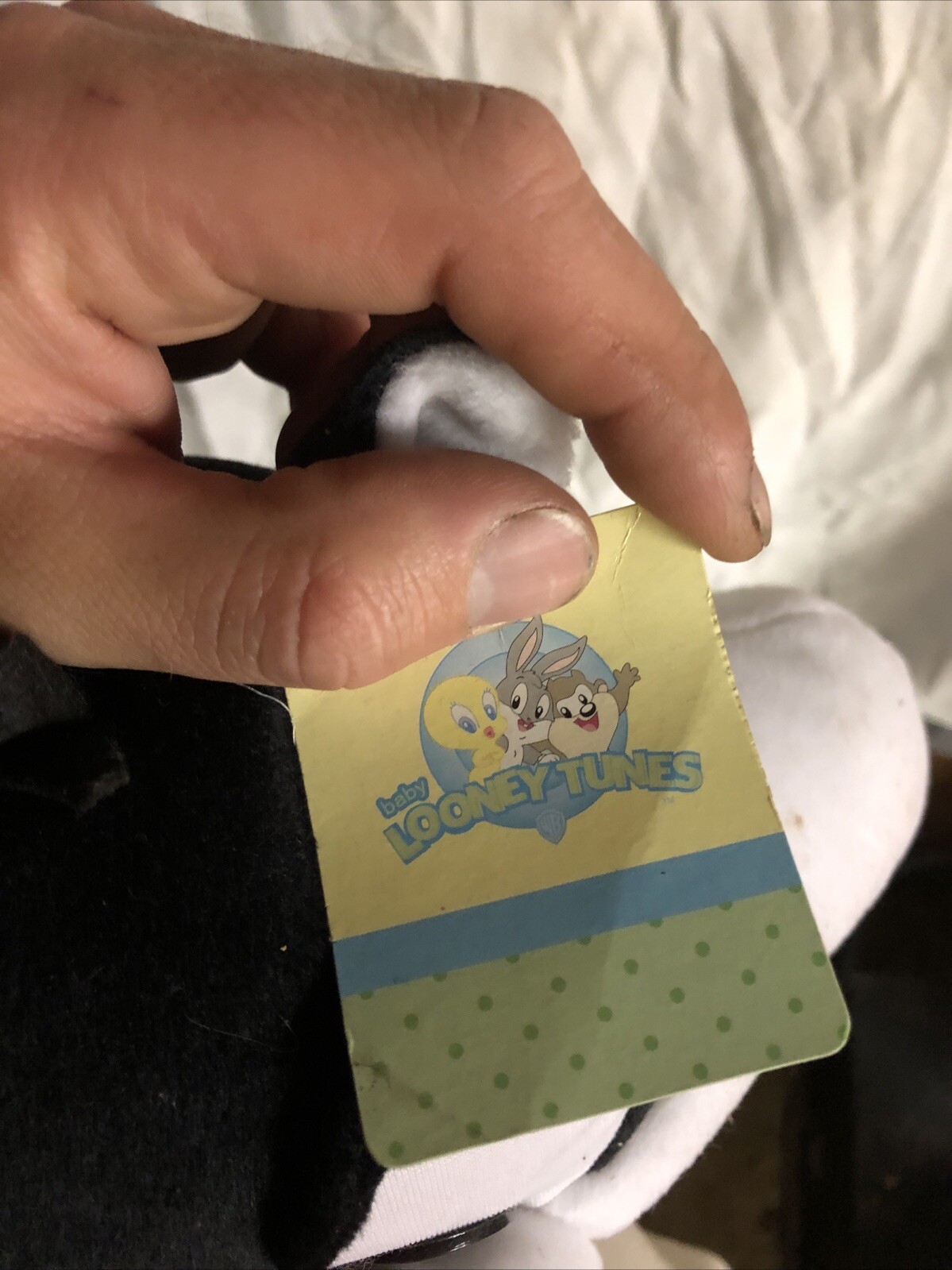 The Looney Tunes Baby Sylvester stuffed animal is a medium-sized plush toy featuring the iconic Warner Bros. character, Sylvester the Cat. Made in China, this retired collectible is designed for children ages 3-4 years old and is part of the popular Looney Tunes character family. Perfect for fans of the classic animated series, this adorable stuffed animal brings a touch of nostalgia and whimsy to any playtime or collection.