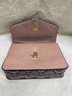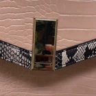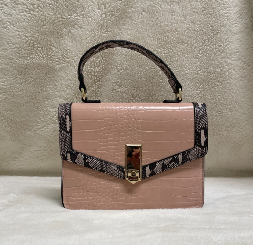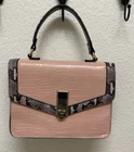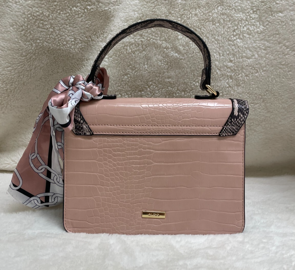 Aldo, small handbag with lots of personality. Pink with pink and grey faux snakeskin trim complimented by gold hardware accents and scarf. Removable, adjustable shoulder strap. Gold hardware for the closure with zip side pocket on the inside as well as 2 open pouches. Perfect for when you only need a few necessities. Add this lovely bag to your collection for feminine, sassy fun. CONDITION: Preowned, great condition. The clasp does have a few scratches on gold hardware. See last picture for reference. MATERIAL: Polyurethane SIZE: Small bag. Approximately 9" with, 7" height, 3" depth, 4" strap hang
