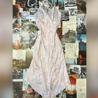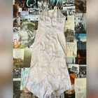 cute pink maxi dress fairy vibes all over asymmetrical hem with the front coming to a pointy V shape and the back having a softer u has a strap that ties behind the neck there are a couple small snags as pictured y2k vintage retro 2000s preppy trendy timeless old school fairy core cottage core cottagecore kawaii indie boho grunge coquette soft core garden romantic hippie boho