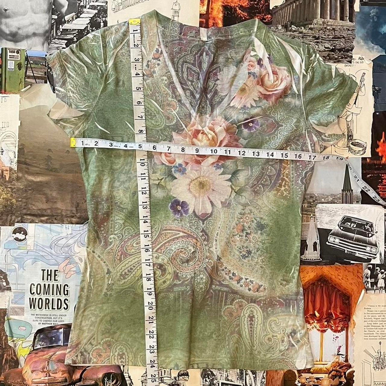 cute y2k top green with pink and white accents floral print all over v neck sheer and lightweight y2k retro 2000s preppy trendy timeless old school fairy core cottage core cottagecore indie coquette soft core garden romantic hippie boho