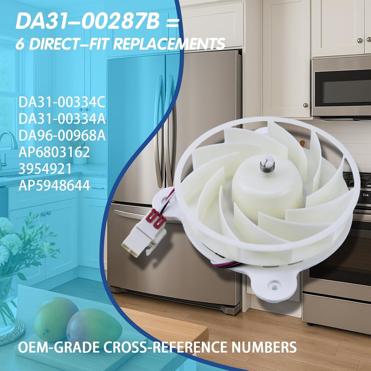 DA31-00287B Fit Guide — Compatible Samsung Models Samsung RF220NCTASR/AA-01, RF220NCTASR/AA-02, RF23J9011SR/AA-00, RF23J9011SR/AA-01, RF23J9011SR/AA-02, RF23J9011SR/AA-03, RF23J9011SR/AA-04, RF23J9011SR/AA-05, RF23J9011SR/AA-06, RF23J9011SR/AA-07, RF23J9011SR/AA-08, RS25H5111BC/AA-02, RS25H5111SG/AA-01, RS25H5111SR/AA-02, RS25H5111WW/AA-02, RS25H5121SR/AA-02 Samsung RS25J500DSG/AA-01, RS25J500DSR/AA-01, RS25J500DWW/AA-01, RF34H9960S4/AA-00, RF34H9960S4/AA-01, RF34H9960S4/AA-02, RF34H9960S4/AA-03, RF34H9960S4/AA-04, RF34H9960S4/AA-05, RF28K9380SG/AA-00, RF28K9380SG/AA-01, RF28K9380SG/AA-02, RF28K9380SR/AA-00, RF28K9380SR/AA-01, RF28K9380SR/AA-02, RF28N9780SG/AA-00 Samsung RF22K9381SG/AA-00, RF22K9381SG/AA-01, RF22K9381SG/AA-02, RF34H9950S4/AA-00, RF34H9950S4/AA-01, RF34H9950S4/AA-02, RF34H9950S4/AA-03, RF34H9950S4/AA-04, RF34H9950S4/AA-05, RF28K9070SG/AA-00, RF28K9070SG/AA-01, RF28K9070SG/AA-02, RF32FMQDBSR/AA-01, RF32FMQDBSR/AA-02, RF32FMQDBSR/AA-03, RF32FMQDBSR/AA-04 Samsung RF32FMQDBSR/AA-05, RF32FMQDBSR/AA-11, RF221NCTASR/AA-01, RH25H5611SG/AA-00, RH25H5611SG/AA-01, RF23J9011SG/AA-00, RF23J9011SG/AA-01, RF23J9011SG/AA-02, RF23J9011SG/AA-03, RF23J9011SG/AA-04, RF23J9011SG/AA-05, RF23J9011SG/AA-06, RF28K9580SG/AA-00, RF28K9580SG/AA-01, RF28K9580SG/AA-02, RB12J8896S4/AA-00 Samsung RB12J8896S4/AA-01, RF220NCTABC/AA-01, RF220NCTASG/AA-00, RF220NCTASP/AA-00, RF220NCTASP/AA-01, RF220NCTAWW/AA-01, RF220NCTAWW/AA-02, RF221NCTABC/AA-01, RF221NCTASP/AA-00, RF221NCTAWW/AA-01, RF22K9381SR/AA-00, RF22K9581SG/AA-00, RF22K9581SG/AA-01, RF22K9581SG/AA-02, RF22K9581SR/AA-00, RF22K9581SR/AA-01 Samsung RF22K9581SR/AA-02, RF22M9581SG/AA-00, RF22M9581SR/AA-00, RF22N9781SG/AA-00, RF22N9781SR/AA-00, RF24J9960S4/AA-00, RF24J9960S4/AA-01, RF24J9960S4/AA-02, RF24J9960S4/AA-03, RF24J9960S4/AA-04, RF28K9070SR/AA-00 Replacement Model DA31-00287B (Samsung evaporator fan motor) directly replaces DA31-00334C, DA31-00334A, DA96-00968A, AP6803162, 3954921, and AP5948644—OEM-grade, plug-and-play fit. On Jan 13, 2026 at 06:16:07 PST, seller added the following information: