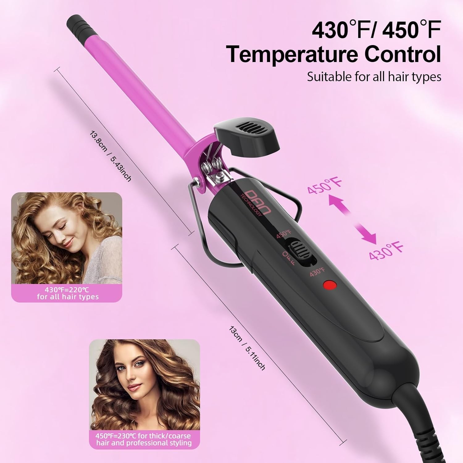 DAN Technology Small Ceramic Curling Wand with Adjustable 3/8 Inch=10MM, Pink Product Details Product Dimensions : 4.72 x 1.77 x 1.77 inches; 8.47 ounces Item model number : CP05C10 Manufacturer : DAN Technology Country of Origin : China Product Benefits: Curling Brand: DAN Technology Hair Type: Fine Material: Ceramic Color: Pink LONG-LASTING HAIRSTYLE TOOL - Go for the DAN Technology thin curling iron for gorgeous defined curls and beach waves. 30s heats up quickly and holds heat evenly with advanced PTC. That means faster styling and locked-in results. Anti-scald cool tip is 100% protect yourself from potential burns. MULTIPLE FUNCTIONS CURLING IRON - With 360° swivel power cord (4.9 ft= 1.5M). Adjusting the tiny curling wand iron freely, you can style your hair at any angle. Dual voltage from 100v to 240v is perfect for using worldwide. TOURMALINE CERAMIC TECHNOLOGY CURLING WAND - Small curling iron with ceramic coating barrel helps seal moisture of your hair and protect cuticle with less frizz and damage, creating shiny tight curls, natural-looking ringlets and long-lasting hairstyles. UNLOCK YOUR PERFECT CURLS WITH EASE - Our advanced curling wand boasts 2 heat settings, 430°F and 450°F. Easy switch for selecting the right temperature. High heat hair curler helps you to achieve ideal curls look in a short time. COMPACT CURLING WAND - Perfect for all hair lengths, including men's hair, this clip curler is versatile for wraps or curls. Its portable size ensures you can style your hair conveniently anytime and anywhere, offering flexibility for your styling needs.