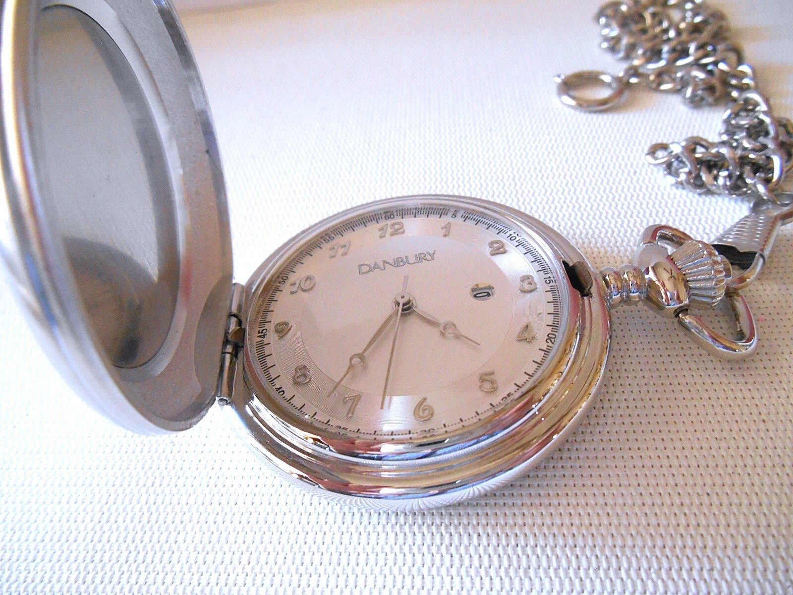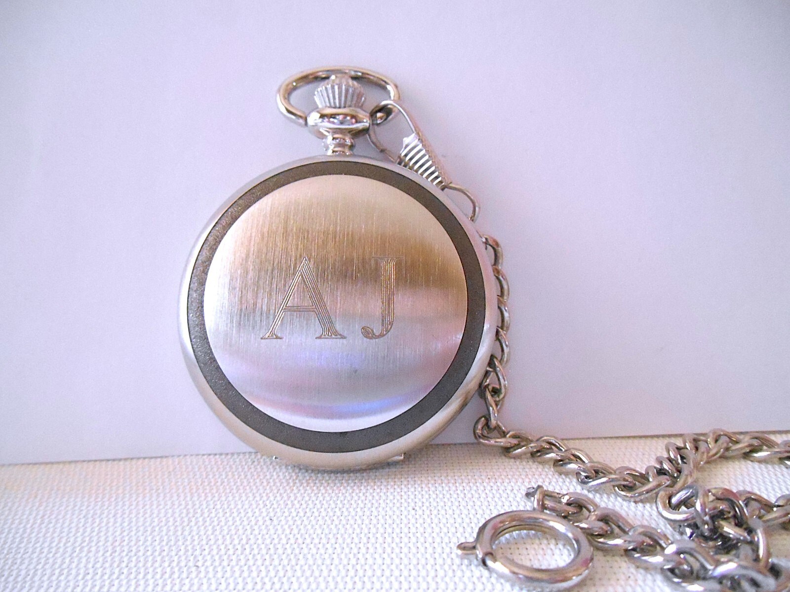 Please note: We do have a cat. Please read description before bidding. Up for bid is a Danbury silvertone pocket watch engraved "AJ" with chain. New battery. Measurement in the pictures. It is in good condition. Photo is of the actual item. I accept several different methods of payment. Payment must be made within 4 days after the close of the auction. *Combined shipping is available. **We ship to Alaska and Hawaii. ***Taxes and fees are the responsibility of the buyer.