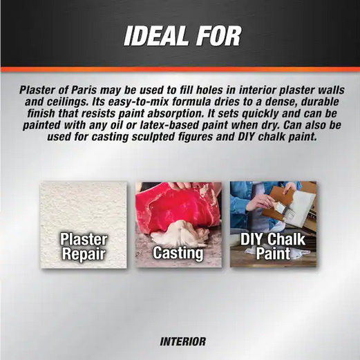 Product Overview: DAP Plaster of Paris is a fast-setting, multi-purpose repair material ideal for patching, molding, and casting. With a set time of just 20 to 30 minutes, it’s perfect for quick repairs and craft projects. This 4 lb. container provides enough material for a wide range of applications, both in home improvement and hobby work. Key Features: Quick-Setting Formula: Sets in 20 to 30 minutes — ideal for fast repairs and projects. Smooth Finish: Dries to a hard, white, and sandable surface perfect for painting or finishing. Versatile Use: Great for patching walls and ceilings, casting molds, creating sculptures, and craft applications. Indoor Application: Designed for interior use only — not recommended for damp or high-moisture areas. Easy to Mix & Apply: Just add water to create a creamy, easy-to-spread mixture. Strong & Durable: Creates a hard, dense surface that resists shrinking and cracking. 4 lb. Size: Ideal for small to medium jobs around the home, school, or workshop.