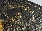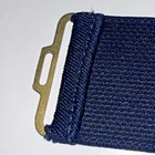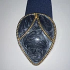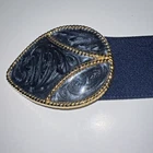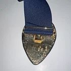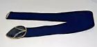DAY-LOR Navy Stretch Belt with Enameled Belt Buckle Gold tone and Navy. 1980's Approximate Measurement 2" x 32". Very Good Condition See photos for details.