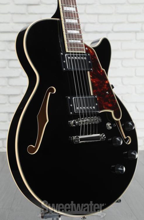 A Sophisticated Semi-hollow Invitation from D’Angelico The D’Angelico Premier SS semi-hollowbody electric guitar puts playability and value first while recognizing the importance of good looks. The Premier SS’s single-cutaway body shape is lightweight, comfortable, and carved from laminate maple. Maple’s bright warmth brings semi-hollow sounds and techniques to life with a smooth, swift attack and plenty of bite or sustain — it all depends on your dynamics and method of attack. Two custom D’Angelico humbucking pickups supply an extensive sonic range, stretching all the way from jazzy cleans to rock ’n’ roll grit. Per-pickup control knobs (carved from natural ebony) facilitate precise switching between two or three distinct tones with the flip of a switch. Sweetwater guitarists like the way this guitar’s “C”-shaped neck finds a happy medium that’s conducive to vintage and modern styles without strain. D’Angelico’s finishing touches adorn each section of the Premier SS in trappings that Sweetwater is an Authorized D'Angelico Dealer Genuine New Item Sweetwater's 2-year warranty and 55 point inspection D'Angelico Premier SS Semi-hollow Electric Guitar - Solid Black Semi-hollowbody Electric Guitar with Maple Body and Neck, Walnut Fingerboard, and 2 Humbucking Pickups - Solid Black A Sophisticated Semi-hollow Invitation from D’Angelico The D’Angelico Premier SS semi-hollowbody electric guitar puts playability and value first while recognizing the importance of good looks. The Premier SS’s single-cutaway body shape is lightweight, comfortable, and carved from laminate maple. Maple’s bright warmth brings semi-hollow sounds and techniques to life with a smooth, swift attack and plenty of bite or sustain — it all depends on your dynamics and method of attack. Two custom D’Angelico humbucking pickups supply an extensive sonic range, stretching all the way from jazzy cleans to rock ’n’ roll grit. Per-pickup control knobs (carved from natural ebony) facilitate precise switching between two or three distinct tones with the flip of a switch. Sweetwater guitarists like the way this guitar’s “C”-shaped neck finds a happy medium that’s conducive to vintage and modern styles without strain. D’Angelico’s finishing touches adorn each section of the Premier SS in trappings that exude confidence. Stairstep tuners, a vintage-inspired Scalini pickguard, block inlays, and an art-deco headstock are just a handful of the perks you can look forward to when you choose the Premier SS semi-hollowbody! Familiar semi-hollowbody construction The Premier SS combines vintage-inspired maple semi-hollowbody construction with a single-cut body shape. The single-cut shape offers the best of both worlds — improved upper-fret access on the treble side, while the bass side’s fuller figure promotes unimpeded sustain that supports melodic movement with low-string resonance. Inside, the Premier SS features a solid center block that keeps feedback at bay and makes it easy to push amp levels or use effects such as reverb, overdrive, and delay. Set-through maple neck construction heightens sustain and tonal quality, and this neck is capped with a walnut fingerboard. Walnut’s smoothness and natural hardwood feel leave guitarists feeling inspired, and players at Sweetwater find that a walnut fingerboard helps with accuracy and consistency, especially when tackling complex chords, such as sevenths or inversions. Custom in-house humbuckers The Premier SS comes loaded with a set of classic-sounding chrome-covered D’Angelico humbuckers. Both pickups use calibrated alnico magnets and vintage-inspired winding specs to provide workhorse tones. Jazz-tinged cleans are imbued with warm soul. Pushing levels to the limit can quickly drive your amp into overdrive, and the clean fidelity makes a potent platform for dirt pedals if you indulge in high-gain distortion and grit. A 3-way toggle allows for easy pickup switching, and each pickup features its own volume and tone knob for maximum tonal versatility. Moreover, control pots are capped with striking ebony knobs for an all-natural look with serious retro appeal. While it may resemble a classic jazz box, the D’Angelico Premier SS is a cross-genre, do-it-all instrument that will ace any live gig or studio session. The D’Angelico legacy After mastering his craft during an 18-year apprenticeship, luthier John D’Angelico opened his own shop in Manhattan’s Little Italy in 1932. Catering to New York’s many jazz musicians over the ensuing three decades, D’Angelico and a single apprentice became New York’s foremost stringed instrument builders, creating over one thousand treasured archtop guitars until John’s death in 1964. After his passing, the D’Angelico legacy lived on only through his rare, legendary instruments. After decades, the D’Angelico brand has resurfaced, bringing back the playability and attention to detail of the company’s New York roots. Today, Sweetwater is delighted to offer this fine line of distinguished instruments. D’Angelico uses state-of-the-art manufacturing processes and the finest available materials to create playable works of art for today’s guitarists. From a modest shop in Little Italy to the world stage, D’Angelico’s dedication to quality craftsmanship ensures that this brand won’t go dormant again. D’Angelico Premier SS Features: Laminate maple body yields a warm, resonant tone with a vintage semi-hollow sound Solid center block effectively keeps feedback at bay D’Angelico humbuckers support jazz-tinged cleans, high-gain distortion, and everything in between Per-pickup volume and tone knob for maximum tonal versatility Comfortable “C”-shaped maple neck Fast-and-smooth bound walnut fingerboard, 14-in. radius, MOP block inlays Tune-o-matic bridge and stopbar tailpiece lock on and transmit the nuances of every note Stairstep tuners ensure solid tuning stability and classy aes
