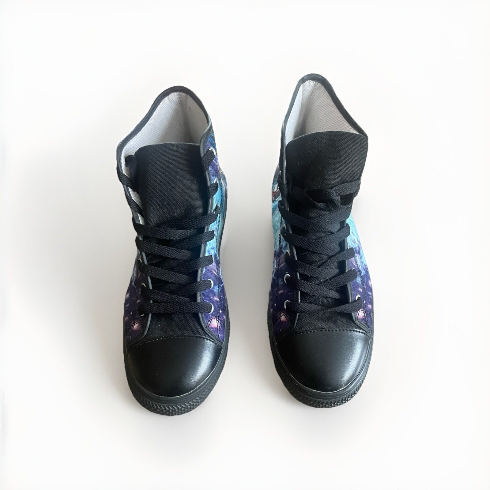 These pre-owned high top Converse sneakers feature a design inspired by DBZ character Goku, with a black canvas upper and lace-up closure. They are a size 9 in both US and UK shoe sizing, suitable for casual occasions. The athletic style sneakers have a breathable construction, rubber outsole. Perfect for fans of Dragon Ball Z looking for a unique and stylish addition to their shoe collection.