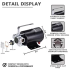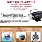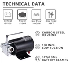 Power: 12volt DC ;Max Flow: 330gph; Max Lift: 39ft Removes Water Down To 1/8" with Water Suction Attachment (Included) Included 6' hose,Water Suction Strainer and impeller replacement kit.This is Self-priming Pump Works great for draining water heaters,water beds,washing machines,or for filling radiant heating systems PLEASE Fill the Water in the Pump Head before First Time use!