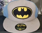 Show off your love for the Caped Crusader with this DC Comics Originals Batman Logo Hat by New Era. This fitted cap comes in a stylish blue and gray color scheme, perfect for any occasion from travel to partying or just casual wear. Made with high-quality materials, this baseball cap features the iconic Batman logo and is sized at 7 1/2 for a comfortable fit. Whether you're a fan of the comics or the cartoons, this hat is a must-have accessory for any Batman enthusiast. Made in Vietnam and designed with attention to detail, this hat is perfect for men who want to add a touch of style to their wardrobe. Get yours today and show off your love for the Dark Knight! *** PLEASE NOTE - STAINING ON TOP OF BRIM (SEE PICS) ***