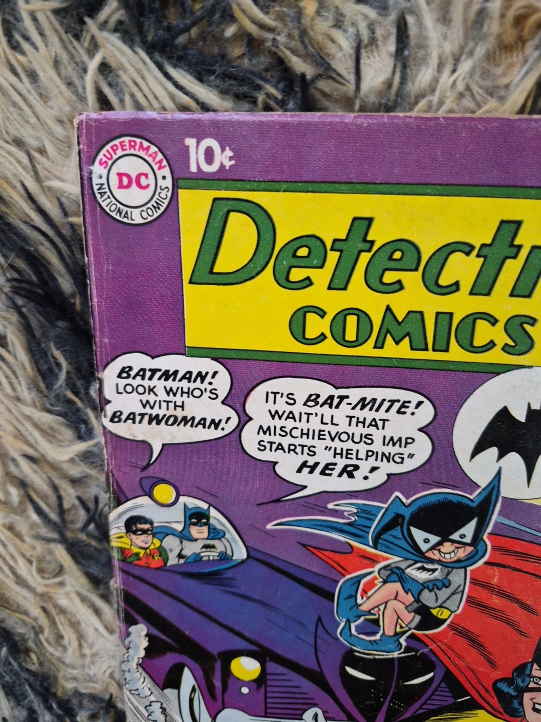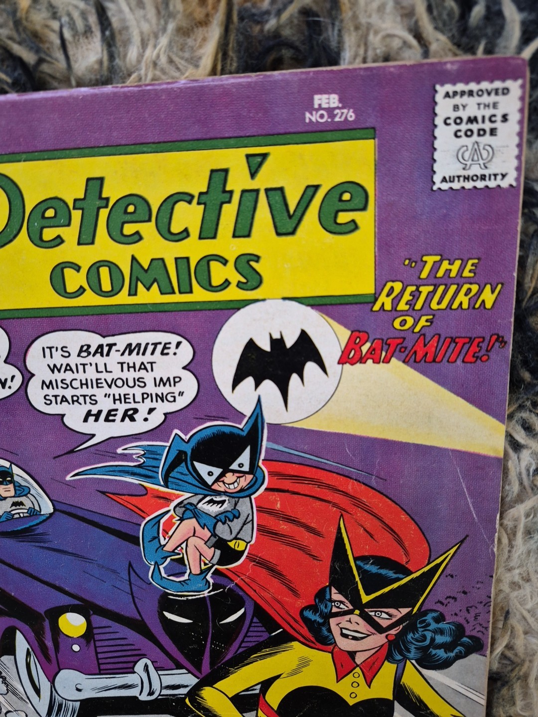 The product is a vintage DC Comics Silver Age Detective #276 from 1960 featuring Batman and Bat-Mite. This single issue comic book is a key issue from the US Comics tradition, with a colorful style and original first printing. It falls within the genres of superheroes, action, adventure, and mystery, making it a sought-after collectible for fans of the DC Universe and Batman series. With its iconic characters and historical significance, this comic book would be a valuable addition to any comic book collection.