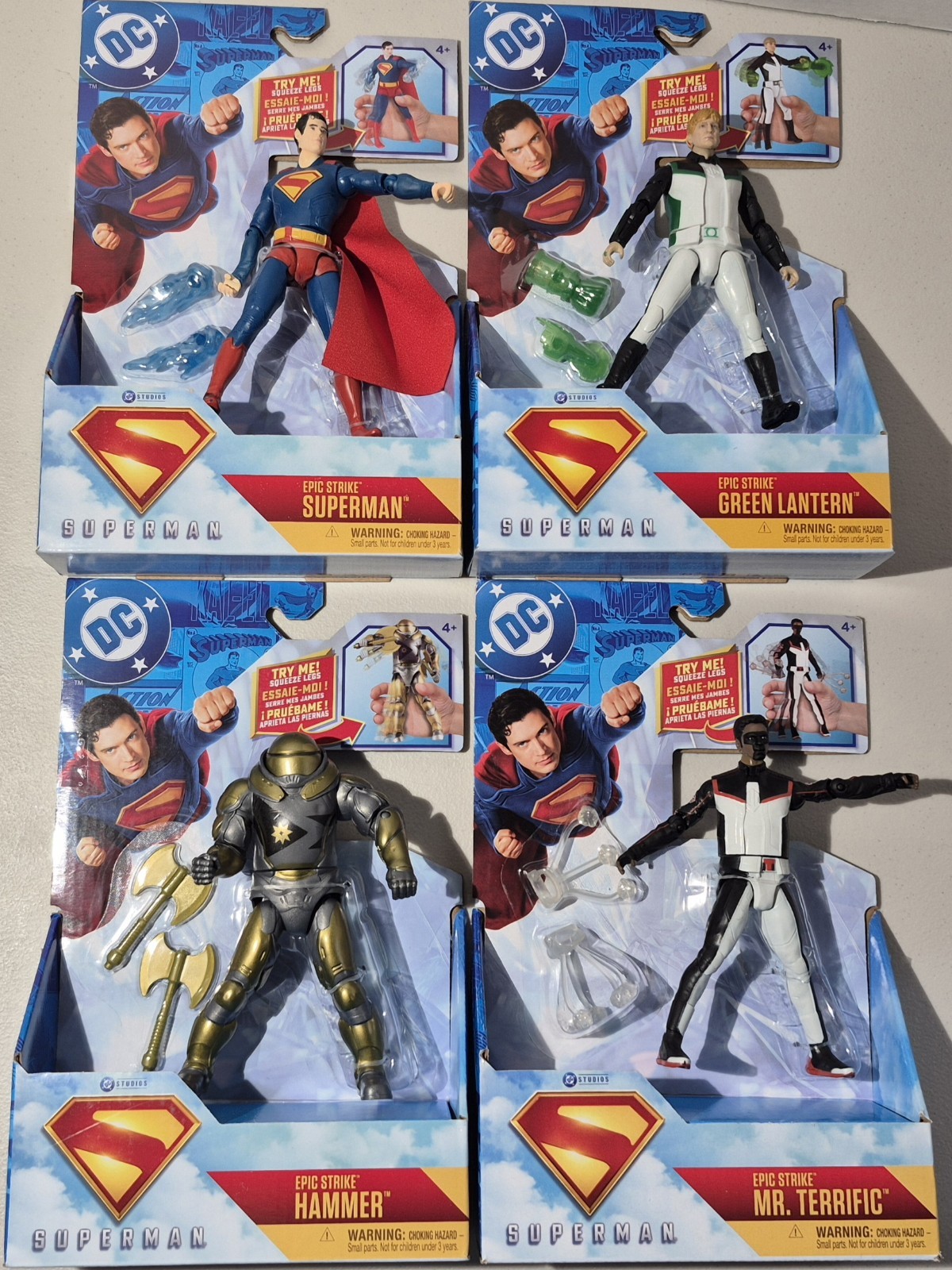 The DC Epic Strike Superman Action Figures are a collection of all 4 characters including Superman, Hammer, Mr. Terrific, and Green Lantern . These action figures are part of the Epic Strike series by Spin Master, featuring twist action punching figures that are 6 inches tall and made of plastic material. These action figures are designed for ages 4 and up and are inspired by the Superman TV show and comic book heroes, making them a must-have for fans of the DC Comics franchise. Each figure comes boxed and adjustable, offering a fun and interactive play experience for young superheroes. Warning: Choking Hazard - Small Parts. Not suitable for children under 3.