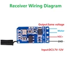 You may also like 8 IN 1 Metal Craft Chinese Ring Puzzle IQ Brain Teaser Kid Adult Educational Toy 10.99 USD 4Pack Durable Fuel Line Tube Hose For Husqvarna 61 66 162 181 266 268 272 281 9.99 USD Pneumatic Foot Pedal Valve FV-320 Momentary 3 Way 2 Position 1/4"PT Threaded 23.99 USD 5V 4-Pin Sunglasses USB Charger Charging Cable For Bose Frames Alto/Rondo/Tenor 11.99 USD 10x Hall Effect Joystick 3D Analog Stick Module For PS5 Dualsense Controller 17.59 USD 3.69 USD 10Pack Plastic+HSS 360° Deburring Tool Steel HSS Rotary Deburr Trimming Handle 10.69 USD Product Description Wireless remote control switch 433mhz rf transmitter receiver 3.7v 4.5v 9v 12v motor Forward Reverse steering Controller module Specifications: Size: 21*11*5mm Input voltage: DC3.7-12V Output voltage: DC3.7-12V Frequency: 433.92MHz Standby current: 0.2MA Maximum load current: less than 0.4A (less than 4 watts of equipment),Suggested load less than 0.2A Working current: 6MA Output voltage: Consistent with the Input supply voltage Remote control battery: 2 x CR2016 Batteries(InCluded) Remote control distance: <=20m Feature: Remote distance receiving, has stable performance, good signal and sensitive response. It can be controlled remotely, making work smarter and more convenient. Ultra low standby current, it is suitable for battery-powered, when it is standby will automatically enter the low-power sleep state, please press the remote control button hold for 0.5 seconds or more) The receiver itself with overcurrent protection,when the current exceeds the rated current,will be entered into turn off power protection,such as the motor to start or block the current is doubled,beyond the rated current will be flash Controller indicator: Momentary - Press and hold the up button to rotate forward, release to stop,Press and hold the down button to reverse and release to stop Delay for 5 seconds - Press and hold the up button to rotate forward, stop 5 seconds after releasing the hand, press and hold the down button to reverse, and stop 5 seconds after releasing the hand, Instruction Manual: 1. Clearing Code: PRESS the Learning Button,until the receiver guidance indicator light does not light up,it mean Clearing Code 2. Learning Code: PRESS the Learning Button,The receiver Led indicator ON.Press remote button A 1 time,Led indicator flash for 1 times, Then Press remote button B 1 time,Led indicator flash for 1 times again,it mean learning successfully Package Includes: 1x DC3.7-12V Wireless Receiver 1x Remote control Note: *For your convenience, the remote control and receiver have been paired *it is the world's smallest motor controller, the motor's voltage and current goes through the receiver,before your purchase .please measure your motor exact working voltage and Current .thank you for your cooperation. *Don't operate control buttons rapidly and frequently , because the controller is controlled by microprocessor , each operation state will response in 1second. *If discover the LED lights darken or remote distance shorter, please replace the battery. Shipping Returns Contact Us Payment 1. Items sent from US warehouse. 2. Receiving time = Processing time + Shipping time. 3. Processing Time: Around 1-2 business Days. 4. Shipping Time: 3-5 business day. It may have a little delay during some holiday (such as Christmas), any problem, please feel free to contact. Always believe we can figure things out with communication, if it comes to return, the pacakge must be intact and the same as you receive. If you have any questions, please feel free to email our service specialists 24 Hours a Day, 7 Days a Week. We will reply you ASAP. Return/refund is accepted within 30 days after the buyer receives the item. NO exchange will be accepted after 30 days from the date when the item is received. Please contact us first before returning your product!!! If you have any questions, our Customer Service staffs welcome you to email us. We strive to answer all questions and resolve any problems as quickly as possible. We care about our valued customers, and will always try to help you. So if you have any problems, You can contact us 7*24, we will reply at the first time. We accept all verified payments from ebay. Orders will be shipped after receiving cleared payment. Shipping 1. Items sent from US warehouse. 2. Receiving time = Processing time + Shipping time. 3. Processing Time: Around 1-2 business Days. 4. Shipping Time: 3-5 business day. It may have a little delay during some holiday (such as Christmas), any problem, please feel free to contact. Returns Always believe we can figure things out with communication, if it comes to return, the pacakge must be intact and the same as you receive. If you have any questions, please feel free to email our service specialists 24 Hours a Day, 7 Days a Week. We will reply you ASAP. Return/refund is accepted within 30 days after the buyer receives the item. NO exchange will be accepted after 30 days from the date when the item is received. Please contact us first before returning your product!!! Contact Us If you have any questions, our Customer Service staffs welcome you to email us. We strive to answer all questions and resolve any problems as quickly as possible. We care about our valued customers, and will always try to help you. So if you have any problems, You can contact us 7*24, we will reply at the first time. Payment We accept all verified payments from ebay. Orders will be shipped after receiving cleared payment. 5G WiFi Omni Antenna 18dBi Full-band High Gain SMA Male Inner Pin Antenna Y 6.49 USD 8.69 USD 4 in 1 Mobile Phone Repair Opening Tools Kit Screwdriver for iPhone Smart Phone; 12.69 USD 1/350 1942 World War II Germany U181 Navy Submarine Model Military Collection 39.99 USD 1m 8K 60Hz USB-C To Displayport 1.4 Cable USB 3.1 Type C To DP W/ PD Charging 17.88 USD 8.69 USD Stainless Steel Watch Screw Extractor Bits For F30209A Watch Repairing Tool C 63.99 USD 8.69 USD Children Alloy Pull Back Air