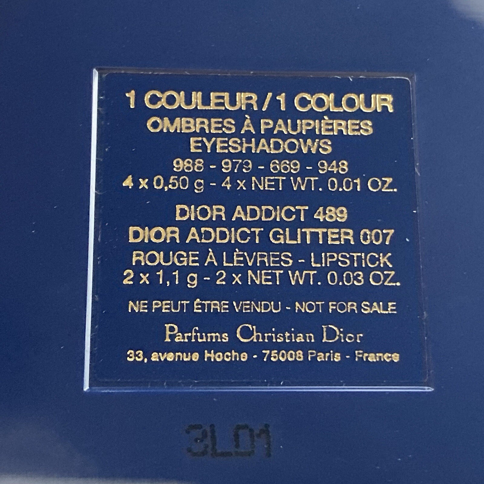 DIOR Parfums by Christian Dior NEW/Unused Makeup Palette in 6 Shades Blue Velvet Envelope EYESHADOWS 988 - 973 - 669 - 948 4 x 0,50 g - 4 x NET WT. 0.01 OZ. LIPSTICK DIOR ADDICT 489 DIOR ADDICT GLITTER 007 2 x 1,1 g - 2 x NET WT. 0.03 Oz. Made in France See photos for more details See our other listings for more luxury brand cosmetics, toiletries and accessories. We combine shipping! Thanks & have a fabulous day!