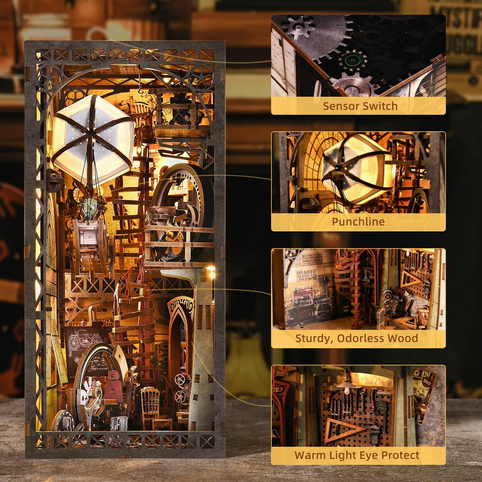 DIY Book Nook Kit BOOK NOOK KIT : A man's journey spans the vast realms of stars and oceans. Do you have a thirst for adventure? Do you desire to delve into the mysteries of the uncharted world? Use the wings of your dreams to soar through the skies and plunge into the depths of the sea. It's a book nook kit, an amassment of an old man's treasures, and the endless quest of a heart perpetually seeking the unknown. Airships, quirky motorcycles, bicycles, cranes, maintenance gear, mechanical ingenuity... Wouldn't you fancy owning a haven like that, always at the ready for your next escapade? Wooden Book Nook Kit:Crafted from durable wood materials, the book nook combines intricate design with practicality. Innovative 3d puzzle structure merges engineering and aesthetic appeal. There's also a touch LED lighting, and the whole booknook is warm and attractive. Book nook kits for adults let people enjoy the satisfaction of building your miniature world. Creative Bookend Bookshelf Insert Decor: Beyond a decorative piece, our book nook - Uncle Peter's Warehouse is a charming display cabinet for your collectibles. its richly detailed scenes add character to any bookshelf or display cabinet, making it a focal point of conversation. Miniature Book Nook Kit: Ideal for teenagers and adults. Decorative bookend fosters interaction among children and adults alike. It sparks imagination and connection, whether as a stimulating toy for teens or a thoughtful gift for birthdays or holidays. 【WARM TIPS】📞The DIY book nook kit has been 100% carefully checked before delivery to ensure that all accessories are complete and not missing. If you have any issues during assembly, please feel free to contact us directly, we will reply you as soon as possible. Note: The battery is not included in package, You need to prepare 2 pcs of AAA batteries by yourself.