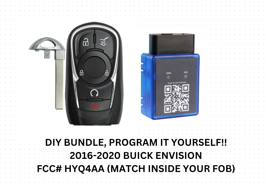THIS AD IS FOR A DIY BUNDLE (PROGRAM IT YOURSELF). IT INCLUDES ONE FOB, DIY TOOL, DOWNLOADABLE APP, AND TECH SUPPORT. VERIFY FCC# HYQ4AA INSIDE YOUR FOB AND THE BUTTON PATTERN PLEASE!! Description Works on the Following Models: Buick Envision 2017-2020 Buttons: Lock Unlock Panic Hatch Remote start Compatible FCC ID: HYQ4AA Compatible IC: 1551A-4AA OEM Part #(s): 13584500 13508406 Frequency: 315 MHz Battery: 2032 Emergency Key: INC Test Blade: HU100 Reusable: Yes (after unlocking) Condition: Aftermarket New