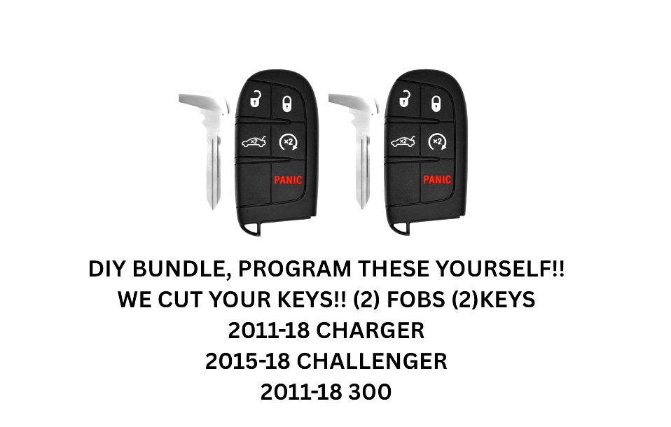 THIS AD IS FOR A DIY BUNDLE PAIR OF FOBS (AFTERMARKET) FOR THE LISTED VEHICLES. ONLY GOOD UNTIL 2017. AFTER THAT IT REQUIRES MORE EQUIPMENT. BE SURE TO MATCH YOUR YEAR, MODEL AND BUTTON PATTERN. WE WILL CUT YOUR KEYS FOR YOU. AFTER PURCHASE, SIMPLY SEND US A CLEAR PICTURE OF YOUR CURRENT KEY BLADES AND WE WILL CUT TO MATCH THEM. DIY TOOL, APP, TECH SUPPORT AND KEY CUTTING IS INCLUDED. Description Works on the Following Models: Chrysler 300 2011-2018 Dodge Challenger 2015-2018 Dodge Charger 2011-2018 Dodge Dart 2014-2016 Buttons: Lock Unlock Trunk Remote Start Panic Compatible FCC ID: M3N-40821302 2AOKM-CYV11 Compatible IC(s): 7812A-40821302 24223-CYV11 OEM Part #(s): 56046759AA-AF 56046777AA-AB 5026676AA-AH RT-130210 Chip: HITAG PHILIPS 46 Frequency: 433 MHz Battery: 2032 Emergency Key: INC Keyway: Y157 / Y159 Reusable: Yes Condition: FOBS ARE Aftermarket New