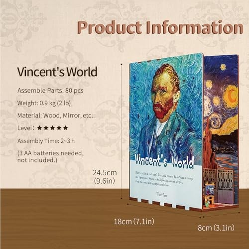 Return Policy Fast Delivery Trusted seller DIY Book Nook Kit for Adults,3D Wooden Puzzle Bookend Bookshelf Insert Library Decor, Booknook Miniature House Kit with Body Motion Sensor LED Light (Vincent's World) Product Description Vincent's World: DIY Book Nook Kit shows Vincent is painting in a courtyard full of stars, and the painting on the board is the well-known painting "The Starry Night". The sunflowers blooming on the table at the back also look like Van Gogh's famous painting "Sunflowers". Auto Sensor Light: book nook DIY kits for adults features smart auto-sensing light which turns on when you approach, and automatically turns off after 1 to 2 minutes. The sensing distance of body varies between 0.5 to 3 meters, depending on the changing of environmental temperatures. Easy to Assemble: The assembly process takes about 4-6 hours. The 3D wooden puzzle book end comes with clear picture instructions, so you don't have to worry about the difficulty of installation even if you are a beginner. The mini craft building kit is suitable for you to install with friends or family for a nice relaxing time. Fantastic Gift: The DIY miniature kit is not only a bookshelf decoration, but also a delicate gift suitable for children, friends and colleagues. The handmade book nook tales is also a surprise gift for holidays such as birthdays, Christmas and other holidays, or for special occasions such as a friend's party. IMPORTANT NOTE: Kindly note that batteries and liquid glue will not be included in the package due to air freight restrictions. You need to prepare 3 batteries (AA type) and Craft Adhesives & Glues or 3-in-1 Advanced Craft Glue. If you have any questions or find any parts missing, please contact our customer service directly and we will resolve all issues as soon as possible. Thank you for your support! Shipping Returns Payment Shipping Shipping is FREE to all addresses other than APO/PO boxes in the lower 48 states. All our stock ships from US-based warehouses. Shipped via USPS or UPS (depending on location and package weight) Unless stated otherwise, all orders will ship within 24-72 hours of your payment being processed. Check our feedback to see the great reviews of FAST shipping we offer. Returns Seller does not accept returns Payment We currently accept payment via eBay managed payments only. Once payment is cleared, we will dispatch your shipment within 1-3 business days. Please refer to the "Shipping" tab for more information regarding shipping speed to your destination.