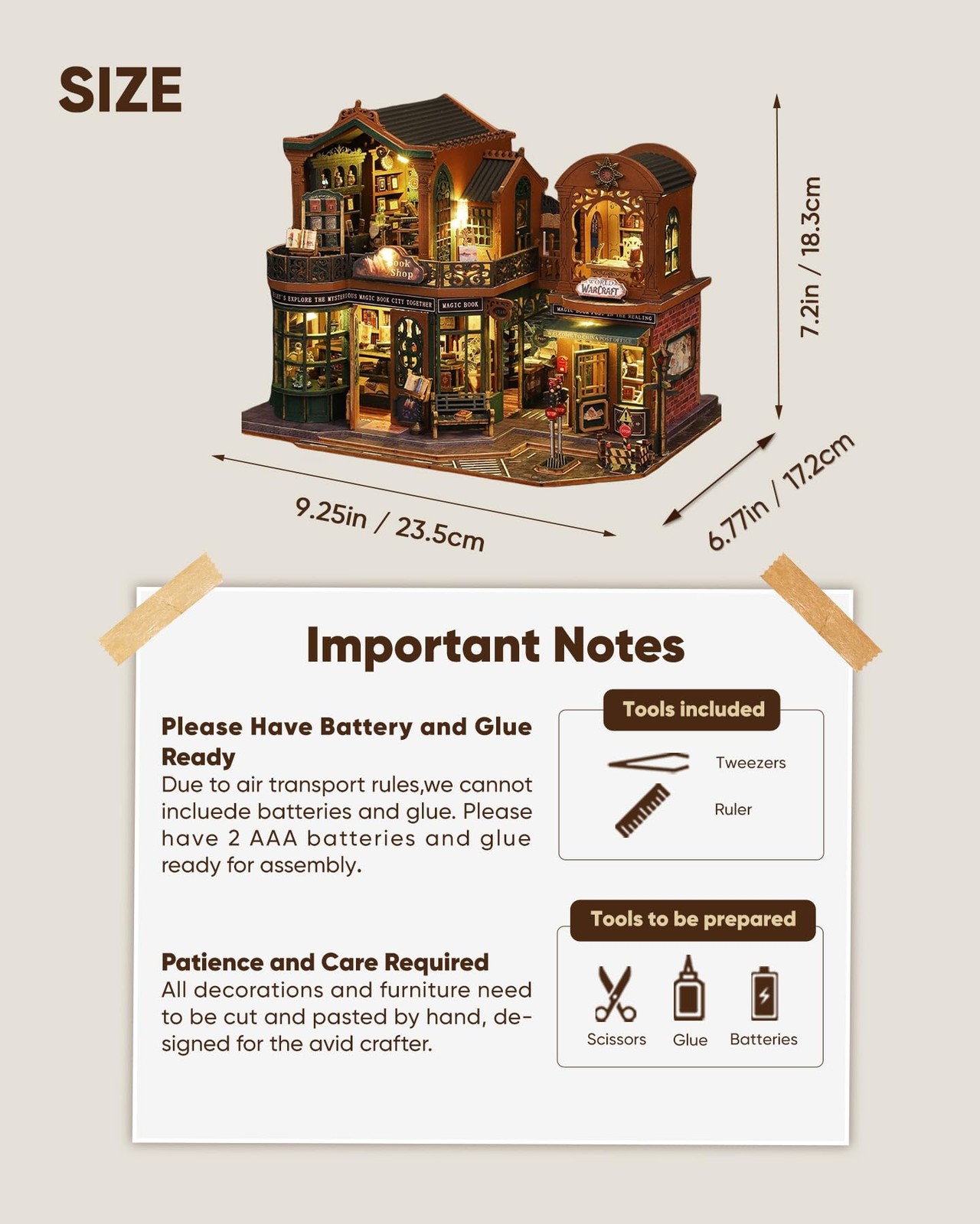 DIY Miniature House Kit, DIY Dollhouse Kit for Adults to Build, Mini House Kit with LED, Mayberry Street Miniatures, Ideal Gifts for Birthday,Christmas(Book ) [Allows for Personalization] The product contains a wide range of accessories, allowing experienced crafters to personalize and mix and match to customize your own miniature house kit. [Detailed Instructions and Tools] The kit comes with a comprehensive instruction manual with clear pictures or diagrams to make the assembly process easier to . [Difficulty Description] It takes about 2-4 days to complete this craft, which is designed for hobby crafters. Please make sure you have enough time and patience to finish this exquisite artwork before you buy it! [Important Note] If you have any questions about the manual, missing and broken parts, you can us at any time. Besides,you need to prepare silicone liquid glue, dust cover and pcs batteries(type AAA)by yourself, because they are forbidden to ship by air transportation. [Gifts & Decorations] Our products have a wide range of uses. It can be used as a gift for family and friends on special holidays such as Halloween, Christmas, Valentine's Day, etc., and it can also be a unique decoration for your home!