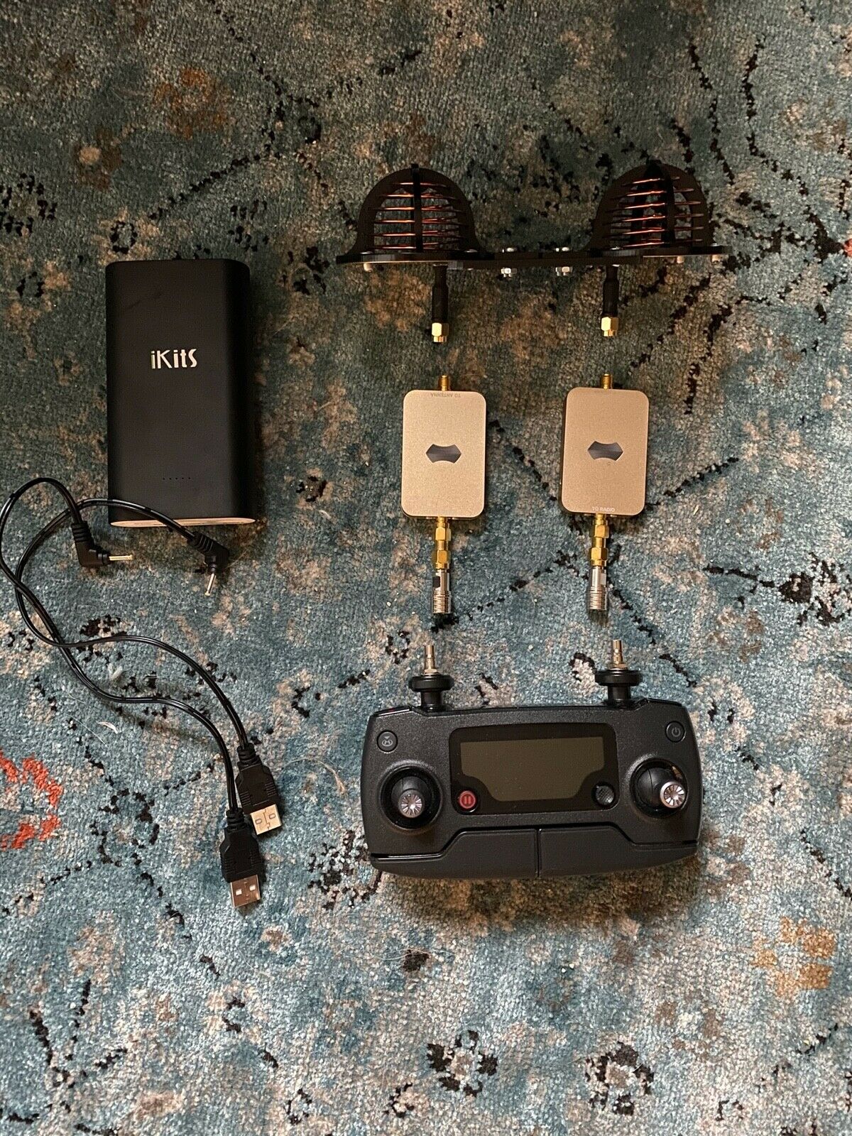 - DJI Mavic Pro Remote Controller upgraded with antenna mode x1. Fast release connectors. - FPVLR DJI MAVIC PRO 10DBI LONG RANGE CIRCULAR ANTENNA - Sunhans eSunRC 3000mW 2.4Ghz 35dBm WiFi Signal Booster x2 - iKits Panasonic Battery Fast Charge Power Bank,10200mAh Aluminum 2 Port Smart Charge Dual port: 2.4A+2.4A x1 - extra sunhans power cables / SMA cables / velcro (see on picture) everything works and connecting to drone drone and case not included!