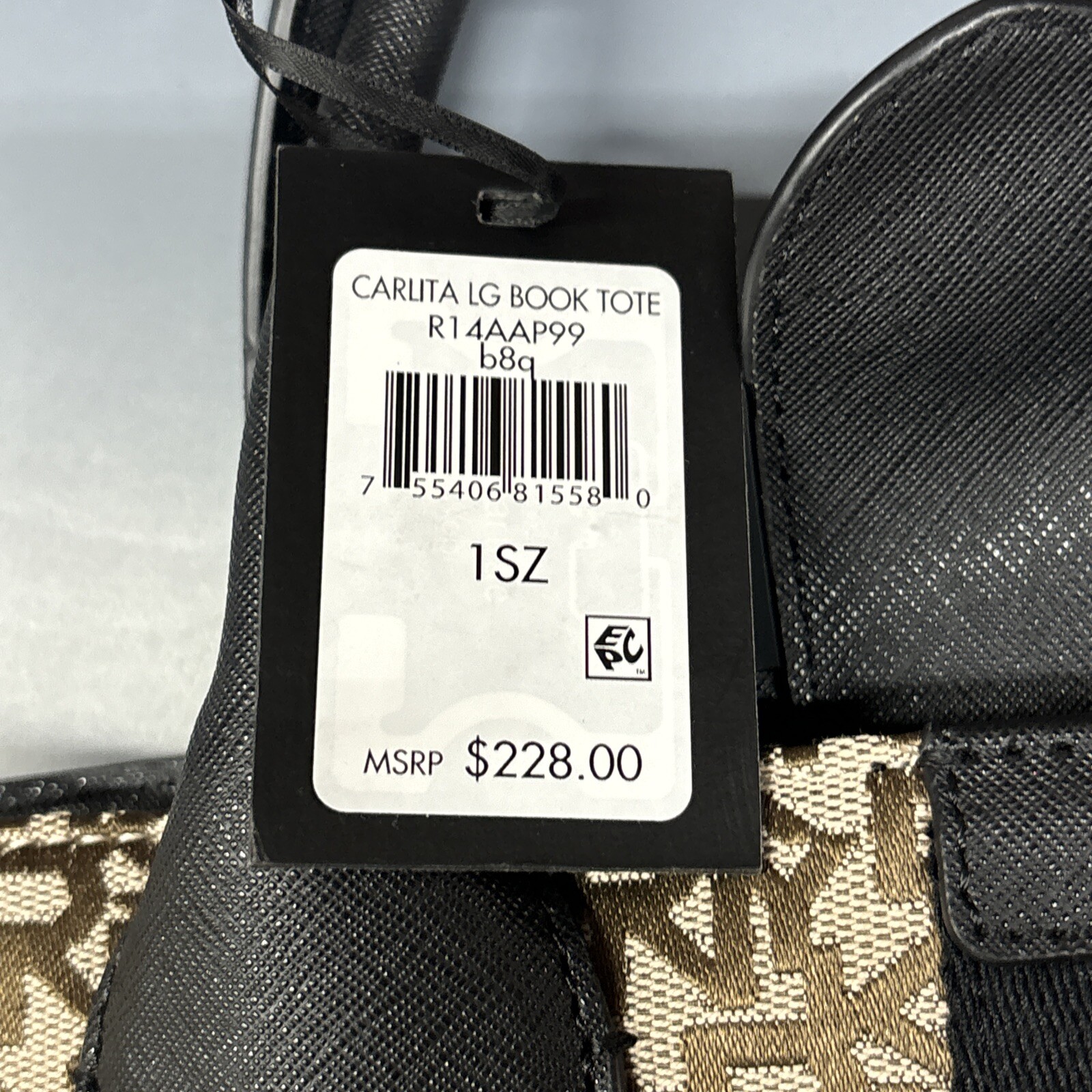 Introducing the DKNY Signature Large Carlita Tote, a stylish and functional accessory perfect for any occasion. This beautiful tote features a rectangular shape with a magnetic and snap closure and double handles with a 7-8 inch drop. The exterior is made of signature fabric in brown and cream, with canvas tan and cream stripe on the front exterior. The tote also comes with a detachable strap and has inner pockets for added convenience. The DKNY Carlita Tote is a designer accessory that is perfect for travel, casual outings, or business meetings. It has a large size of 16 inches in width, 13 inches in height, and 7 inches in depth. The tote is made of high-quality leather and has silver logo hardware. The lining material is beige fabric, and the lining color is beige. The tote is a part of the Carlita product line and has a monogram pattern. It is not handmade, and the handle style is double handles.