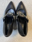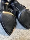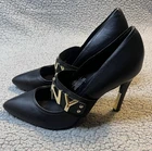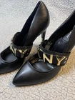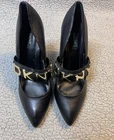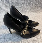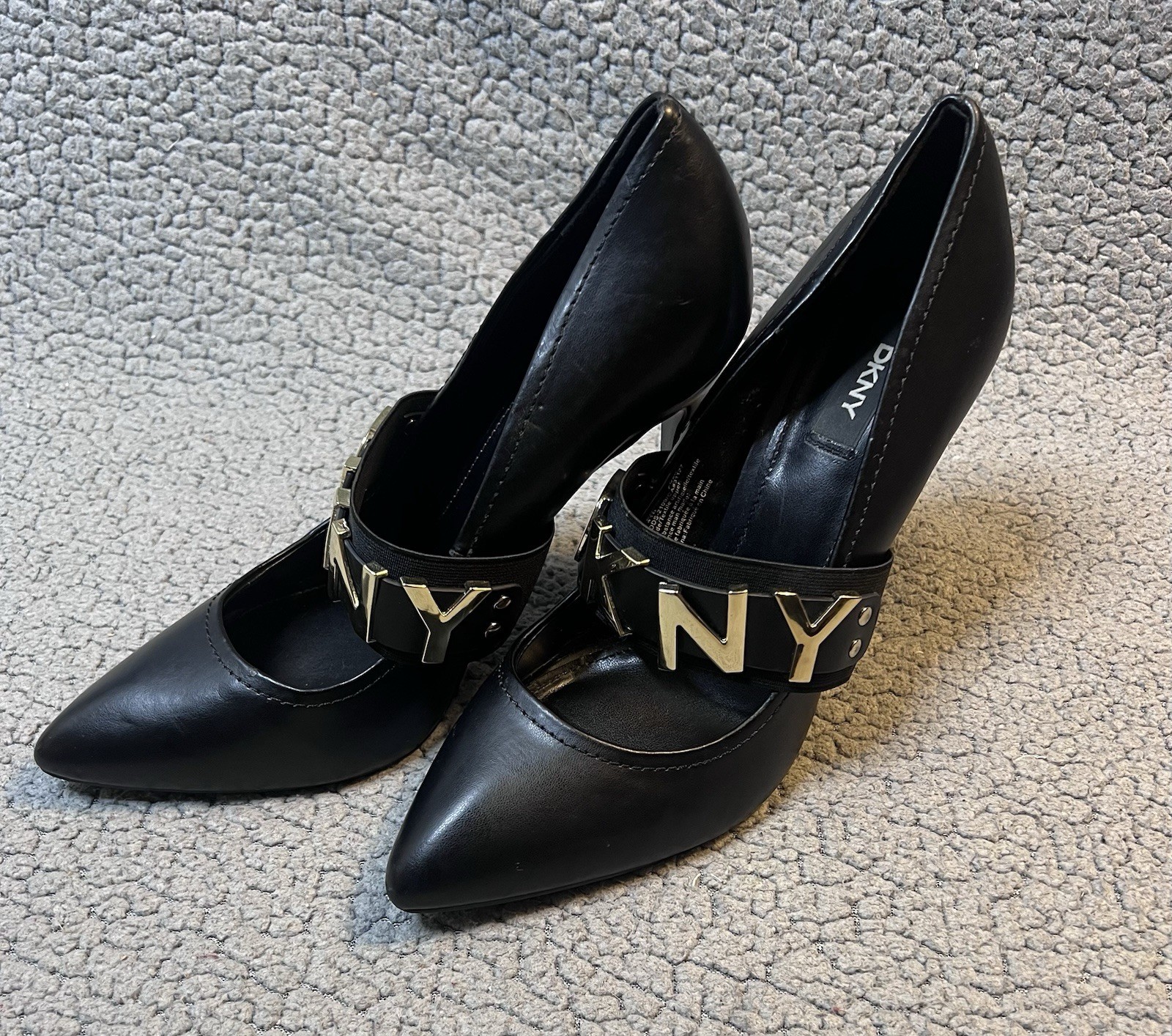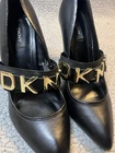 DKNY Genevieve Black Pump Heels With Women’s Size 10 Gold Logo on front fair condition front is fine and bottoms and inside the back of the heels have a few marks as shown in photos any further questions please contact us any flaws are shown in photos SKU(A125)