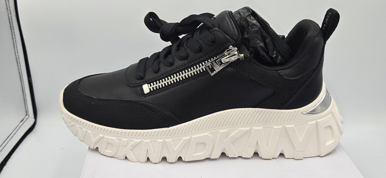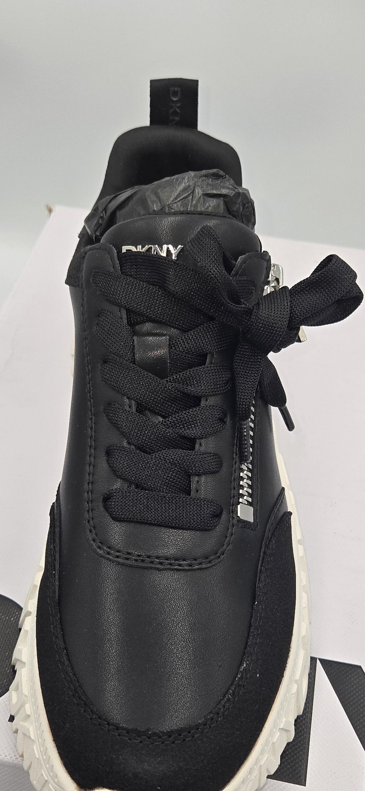 Brand: DKNY Model/Style: Lakelyn - Platform S platform fashion shoes with lace-up front and medial side zipper. Color: Black upper with white chunky DKNY-embossed platform sole and silver-tone heel detail. Gender/Size: Womens US 8 (EU 38.5 / UK 5.5) as shown on the box label. Style/Model code: K4487528. Branding: DKNY logos on tongue, heel plate, outsole and embossed around midsole. Design details: Padded collar, pull tab, rubber lug outsole, suede-like toe/quarter overlays, sneaker-inspired silhouette. EAN: 7540373478415