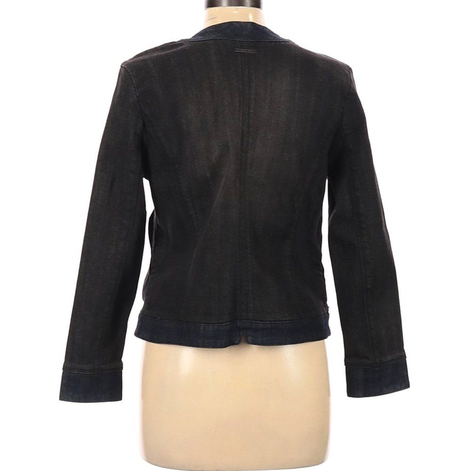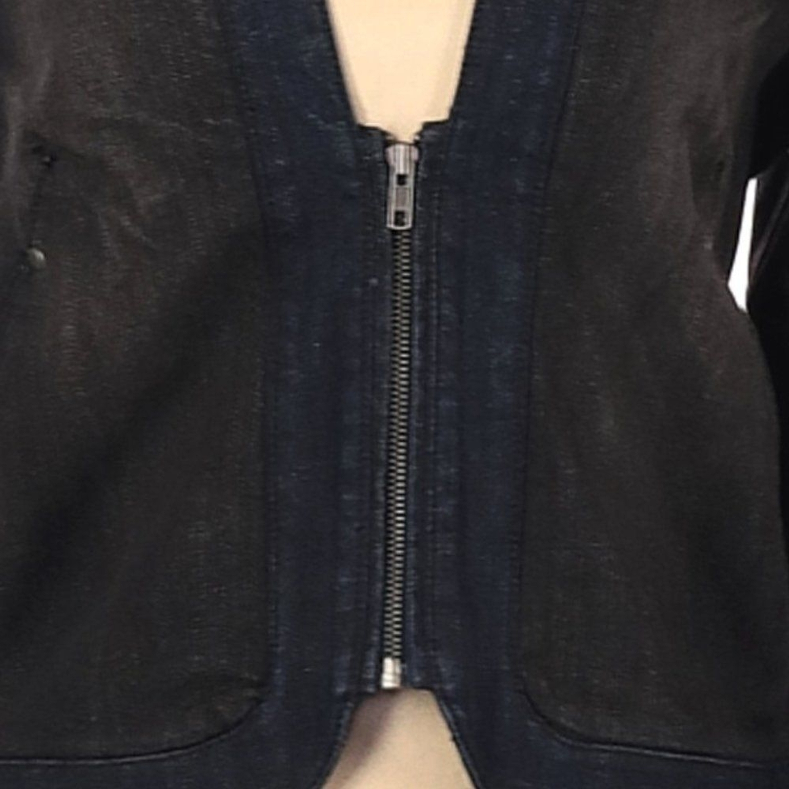 DESCRIPTION Jacket Solid Black and navy 2 diagonal pockets on the front MATERIALS 98% Cotton, 2% Spandex MEASUREMENTS Size L
