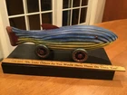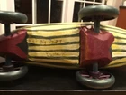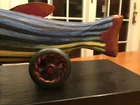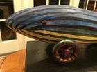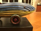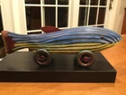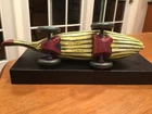 Wonderfully carved and handpainted “Big Stripey” by Dona Dalton is a great, colorful piece of folk art in the form of a toy. Measures about 11.75” long - and it does roll. Signed by the artist on the bottom. Please see pics and feel free to ask any questions. Please see our other listings - always glad to combine/ discount shipping About the artist: "I have a strong attachment to the old toys and objects I had as a child, and it comes out now in my love of animals and mythology. " Dona Dalton considers her work to be "toys as sculpture." Drawing from observation, and an enthusiasm for the narrative potential of Egyptian mythology, she creates works that imply relationship and connection, playfulness and spirituality. A bird at the workplace or a cat in a boat can be the best of companions. Using poplar, pine, and aspen, Dalton carves wood on a band saw, and uses a rotary carver for smaller figures and details. Like icing on a cake, the colorful layers of acrylic paint, latex enamel, and metallic leaf bring each piece to life. Dona Dalton received a BFA in sculpture from the Philadelphia College of Art. Her work has been shown at the American Craft Council Show, the Philadelphia Museum of Art Craft Show, and the Washington DC Craft Show, among others. Her work can be found in galleries throughout the USA.