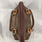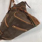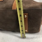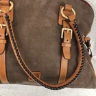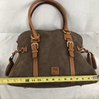 This is a Dooney & Bourke Florentine Leather Brown Suede Domed Buckle Satchel Tote for women. It is a large rectangular satchel/top handle bag with a zip closure and double brown leather handles. The bag features brown suede and leather exterior, gold hardware, red leather lining, and inner pockets. It includes bottom studs, a key clip, and a tassel accent, making it suitable for travel, workwear, and casual or business occasions.