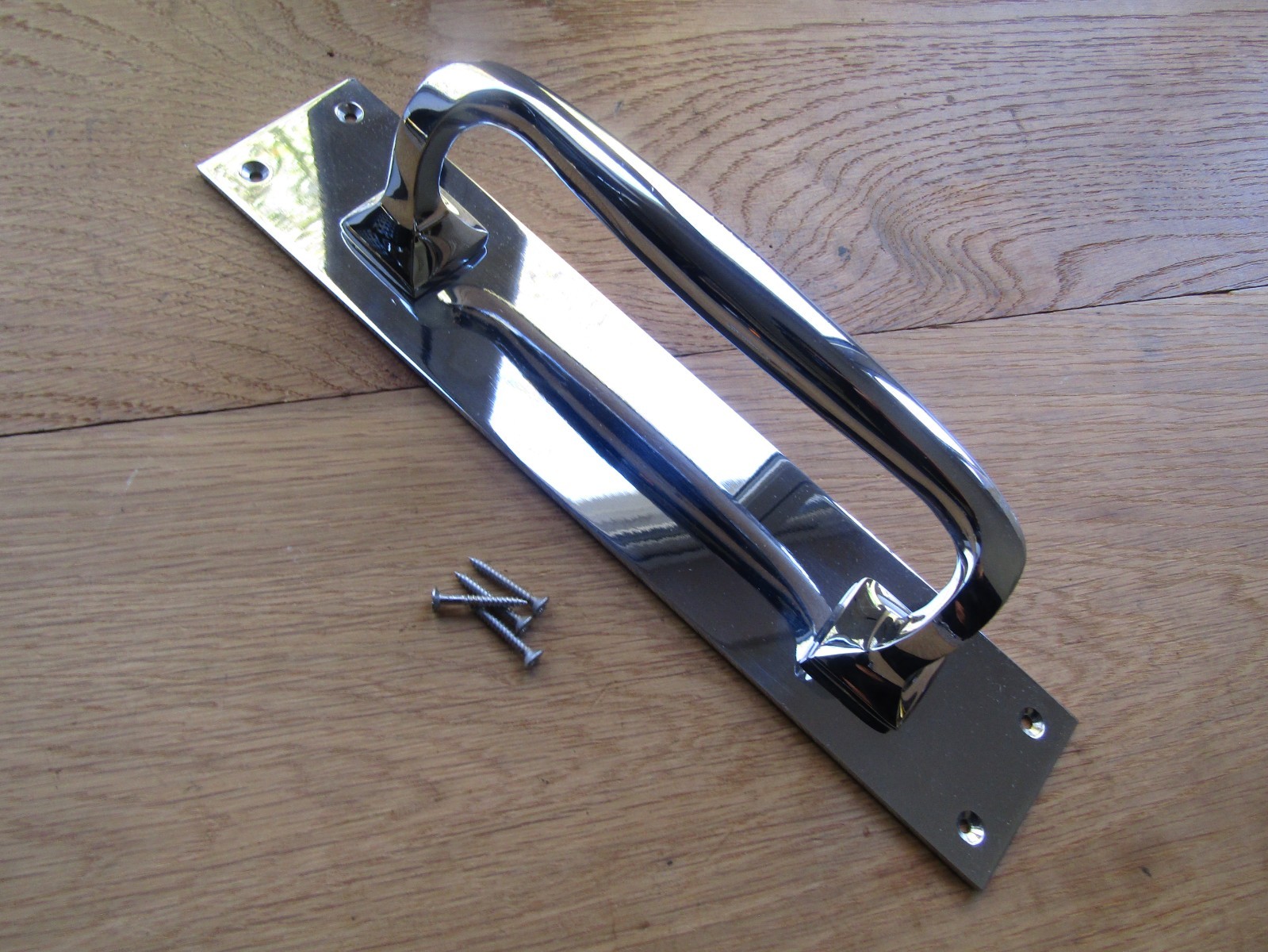 Offset HANDLE ON PLATE C/ W SCREWS SOLD AS SINGLES Height 305mm Width 63mm Depth 58mm Diameter of pull 20mm Height of grip 193mm See last image for dimensions Stylish pull handle that is ideal for public buildings such as schools and hospitals. Hard-working and stylish handles that will stand up to use in commercial and domestic environments Offers outstanding protection against corrosion, even in damp or external environments Plated finish is ideal for high use environments wont break down or tarnish Polished brass-solid brass construction Polished chrome-solid brass construction Satin Anodised aluminium-Aluminium construction