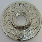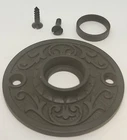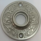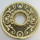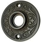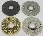 DOORKNOB ROSETTE Round Floral Pattern ornate door plate passage backplate Victorian black nickle brass antique vintage retro fancy designer Doorknob rosette. Forged brass. With floral pattern. Your choice of 4 different finishes. Overall Size: 2-3/16" Diameter Projection is 3/8" Bushing/Collar Diameter is 3/4" Inside hole from back plate is 9/16" Center to Center mounting hole to hole is 1-11/16" Sold Individually, comes with finish matching screws and bushing/collar. FK-8743