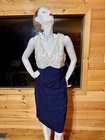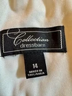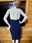 Elevate your wardrobe with this stunning Dressbarn Collection dress in a beautiful navy blue color with ivory lace accents. The dress features a flattering V-neckline and is made of a comfortable and stretchy jersey fabric, perfect for any occasion. The pleated and layered design adds a touch of elegance, while the ruched details give it a stylish and trendy look. This dress is perfect for women who want to feel comfortable and look great. The sleeveless design is perfect for warmer weather, and the knee-length dress is great for any occasion. The pullover closure makes it easy to wear, while the fabric type ensures that it will last for years to come. Add this dress to your collection today and elevate your style!