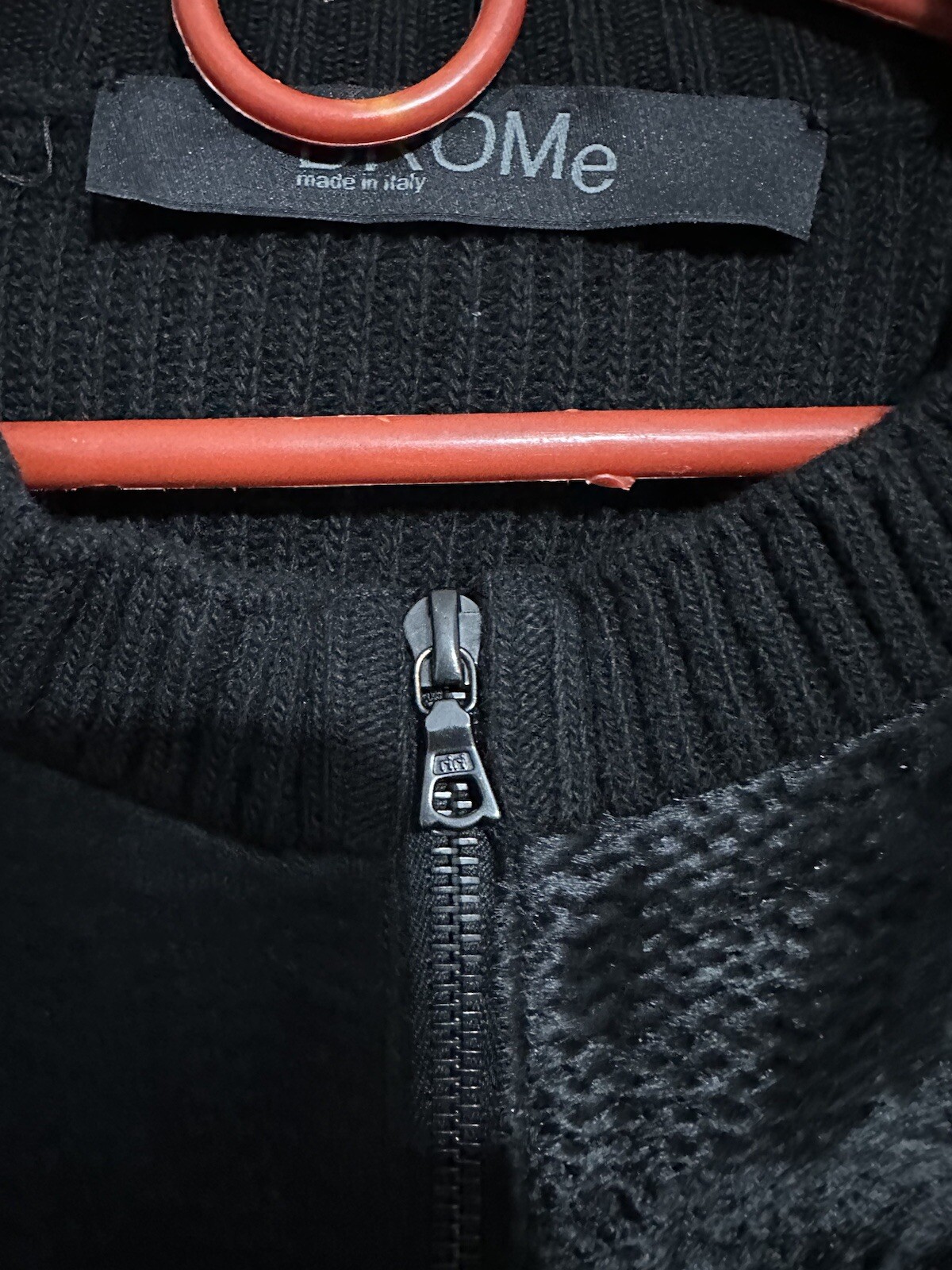 This DROMe jacket is a stylish and versatile piece that can be worn for various occasions. The jacket is made of genuine shearling sheepskin fur, which provides insulation and warmth during the fall and winter seasons. It features a collared design, pockets, and a button closure. The jacket is reversible, and its solid black color makes it easy to pair with different outfits. It is a classic fit and is available in size S. The jacket is made in Italy and should be dry cleaned only.
