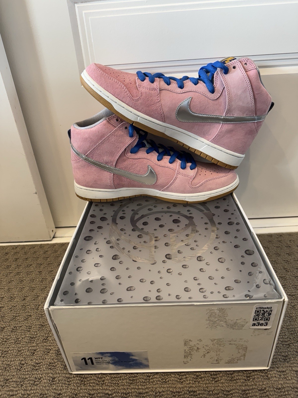 DS Nike Dunk SB High Concepts - When Pigs Fly (SPECIAL BOX) sz 11 - Skate Shoe. This unique and vibrant sneaker from Nike features a high top shoe shaft style in a striking pink colourway with a pig-themed design. The lace-up closure ensures a secure fit, making it perfect for activewear or casual occasions. Manufactured in Vietnam in 2012, this limited edition Nike SB Dunk High is a must-have for sneaker collectors and enthusiasts alike. BRAND NEW CONDITION! OG BOX AND BLUE, GREY, BLACK, LACES! SLIGHT DAMAGE TO 2 CORNERS OF BOX. No lace locks or dubraes. Have GOAT receipt for this purchase. GRAB THIS RARE STEAL! BUY WITH CONFIDENCE!