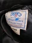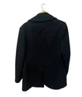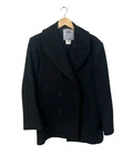 This DSCP Double Breasted Peacoat in black is a classic mid-length coat made from wool, featuring a sailor collar and button closure. It is part of the Quarterdeck Collection inspired by the US Navy, with a vintage style and accents. This pea coat is lined with nylon and suitable for winter, fall, and spring seasons, making it versatile for travel, casual, formal, or workwear occasions. Perfect for a size 42 regular fit, this coat exudes a hipster, patriotic, nautical, and retro vibe with a touch of outdoor and classic style.
