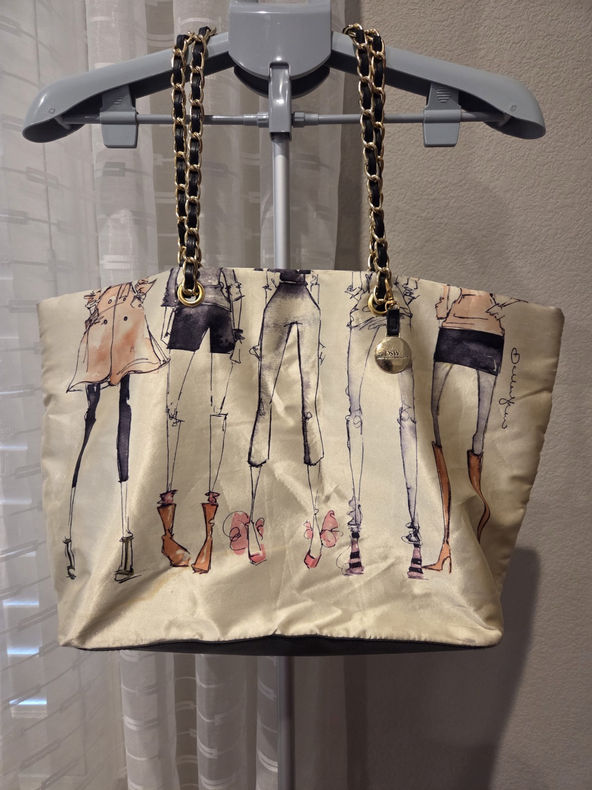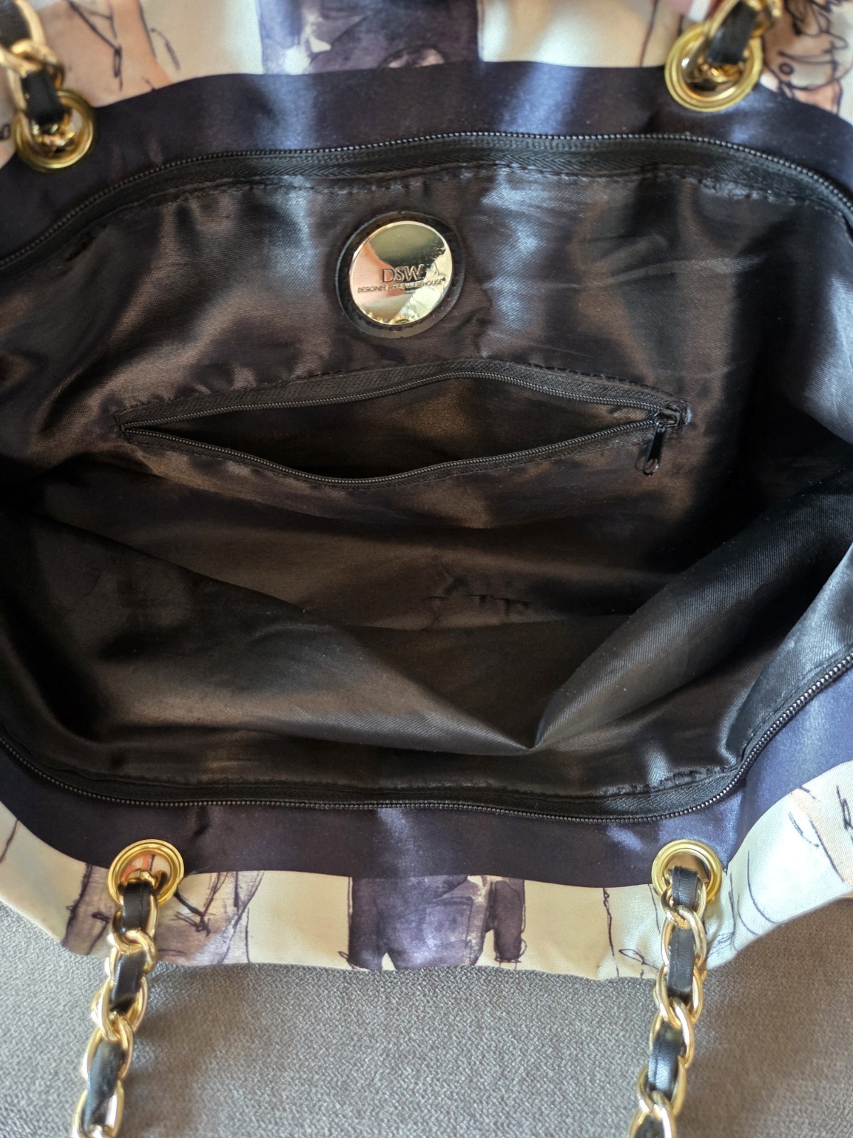 This DSW Tote Purse 20 Years of Shoes Anniversary Chain Shoulder Bag is a stylish and spacious accessory perfect for any occasion. With a rectangular shape and a large size, this purse features a zip closure, black and gold handle/strap color, and gold hardware accents. The exterior color is off white with a satin finish, and it includes a chain strap for added convenience. This designer purse from DSW is a must-have for any woman looking to make a fashion statement with their choice of handbag.
