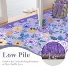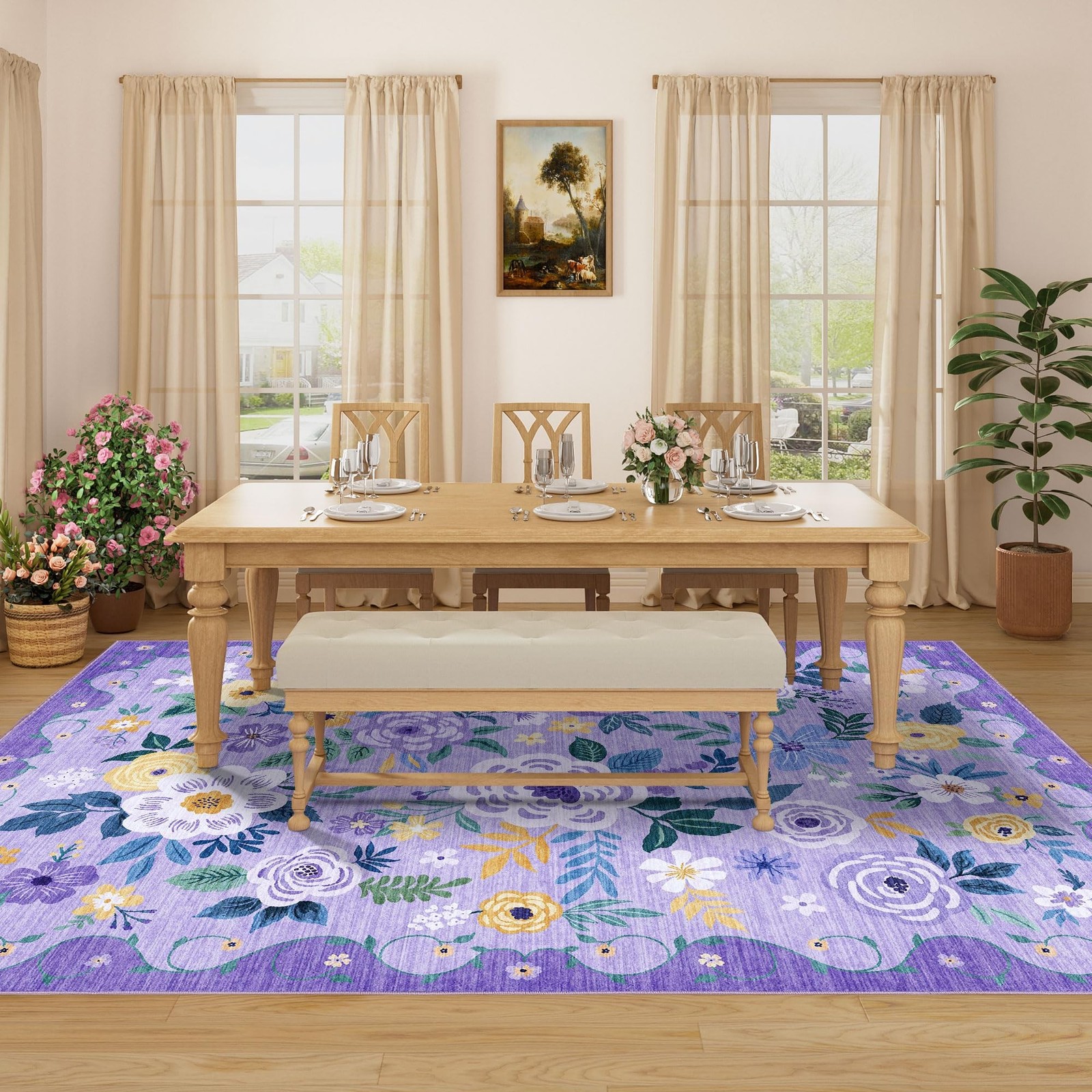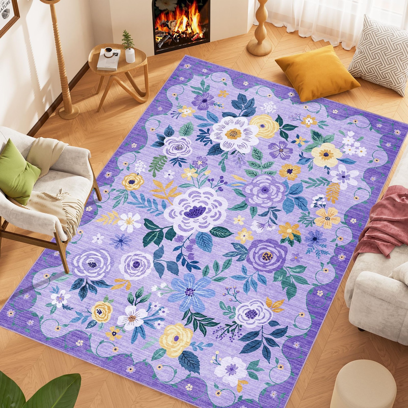 DUKINO 6x9 Area Rug, Floral Rugs for Living Room, Lightweight Non Slip Washable Rug, Indoor Low Pile & Non-Shedding Boho Design Rugs for Bedroom, Living Room, Dining Room, Purple Product Details Color: Purple Size: 6' x 9' (Rectangular) Brand: DUKINO MPN: Floral Rug UPC: Does not apply EAN: Does not apply Brand: DUKINO Size: 6' x 9' (Rectangular) Material: Faux Wool Weave Type: Machine Made Item Weight: 8.8 Pounds Brand: DUKINO Size: 6' x 9' (Rectangular) Material: Faux Wool Weave Type: Machine Made Item Weight: 8.8 Pounds Pile Height: Low Pile Construction Type: Machine Made Back Material Type: Polypropylene Color: Purple Indoor/Outdoor Usage: Indoor Theme: Floral Is Stain Resistant: Yes Product Care Instructions: Hand Wash Only, Machine Wash, Spot Clean Only Pattern: Floral Shape: Rectangular Special Feature: Foldable, Non Slip, Shed Resistant, Stain Resistant, Washable Room Type: Bathroom, Bedroom, Dining Room, Nursery Room, Playroom Product Dimensions: 108"L x 72"W Rug Form Type: Area Rug Style: Floral Item Thickness: 0.2 Inches Warranty Type: Limited Warranty Material Feature: Soft, Durable, Non-Shedding Model Name: Floral Rug Item Weight: 8.8 pounds Manufacturer: Tianjin Nuomeijia Carpet Co.,Ltd Item model number: Floral Rug Date First Available: April 1, 2025 Ultra Soft Material: Indulge in comfort with our living room rug, featuring reinforced edges for durability and minimal shedding. The non-slip TPR backing ensures stability and safety, providing an ultra-soft feel perfect for pets and kids. Washable Rug: Designed for convenience, our floral rugs for bedroom resists stains with easy wipe-offs and tackles daily dust with a simple vacuum or sweeping robot. For thorough cleaning, its washing machine-safe. Low Pile Design: With a low 0.2-inch pile height, this boho area rug fits seamlessly under furniture and in entryways. Ideal for high-traffic areas, it doesn't obstruct doorways and offers comfort underfoot. Vintage Floral Style: Enhance your bedroom decor with our area rug adorned with colorful floral motifs. Its vintage design adds charm to any space, creating a cozy atmosphere that complements a variety of interior styles. Customer Commitment: Rest assured with DUKINO's dedicated customer service. If your rug arrives with temporary creases, simply flatten them out with a heavy object or by flipping it over for 1-3 days. Our support team is ready to assist you for complete peace of mind.