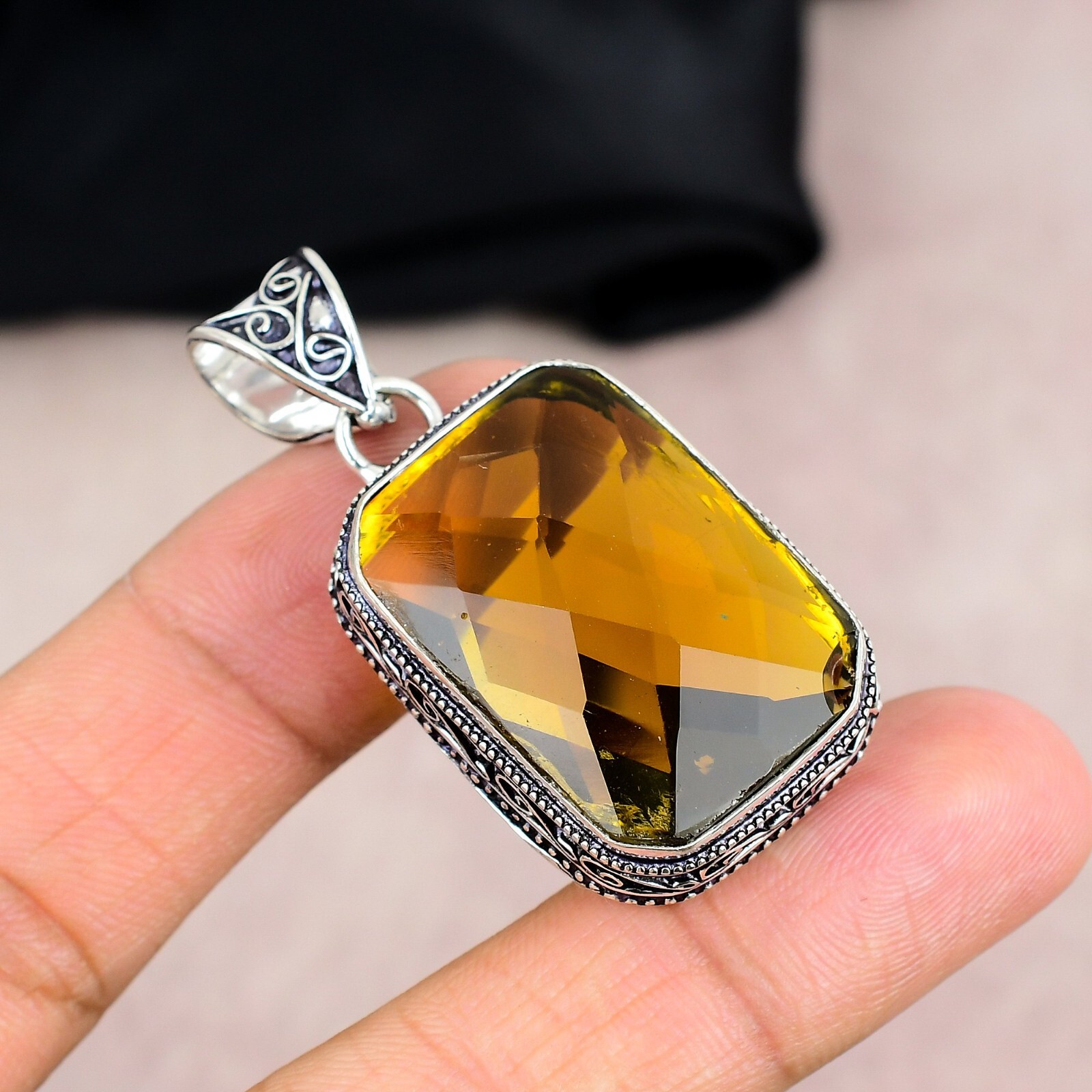 Diamond Clarity Grade:N/AChain Type:N/AMaterial:GemstoneType:PendantTotal Carat Weight:10 carat and aboveNecklace Length:5"Country/Region of Manufacture:IndiaColored Diamond Intensity:N/ACollection:HandmadeMain Stone:CitrineMetal:Sterling SilverClosure:Same As PictureSecondary Stone:N/AColor:SilverNumber of Gemstones:1Theme:Beauty, Bohemian, Ethnic, Halloween, Love, NatureNumber of Diamonds:N/APendant/Locket Type:Same As PictureSetting Style:BezelCountry of Origin:IndiaMain Stone Creation:NaturalDiamond Color Grade:N/ACertification:N/ABrand:HandmadeMain Stone Treatment:Not EnhancedOccasion:Anniversary, Birthday, Christening, Christmas, Engagement, Father's Day, Graduation, Mother's Day, Valentine's Day, WeddingFeatures:HandmadeMain Stone Shape:EmeraldMetal Purity:925Cut Grade:N/AStyle:PendantBase Metal:Sterling SilverMain Stone Color:YellowPendant Shape:Same As Picture