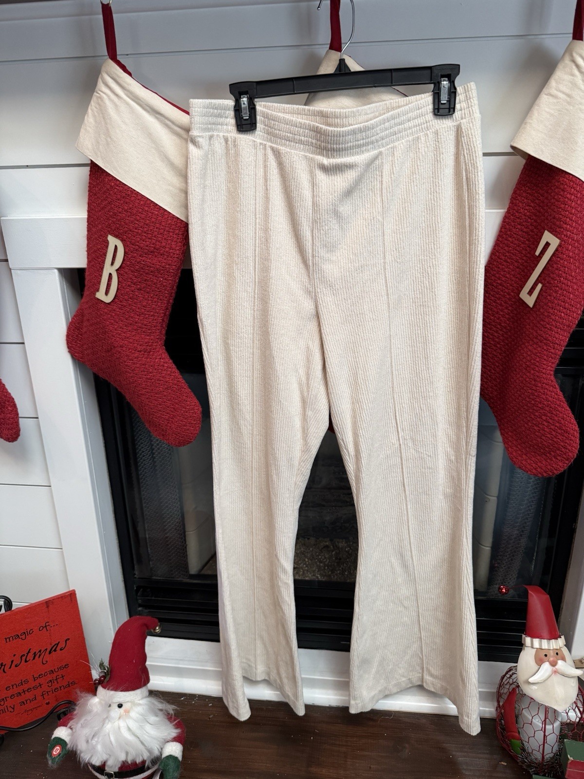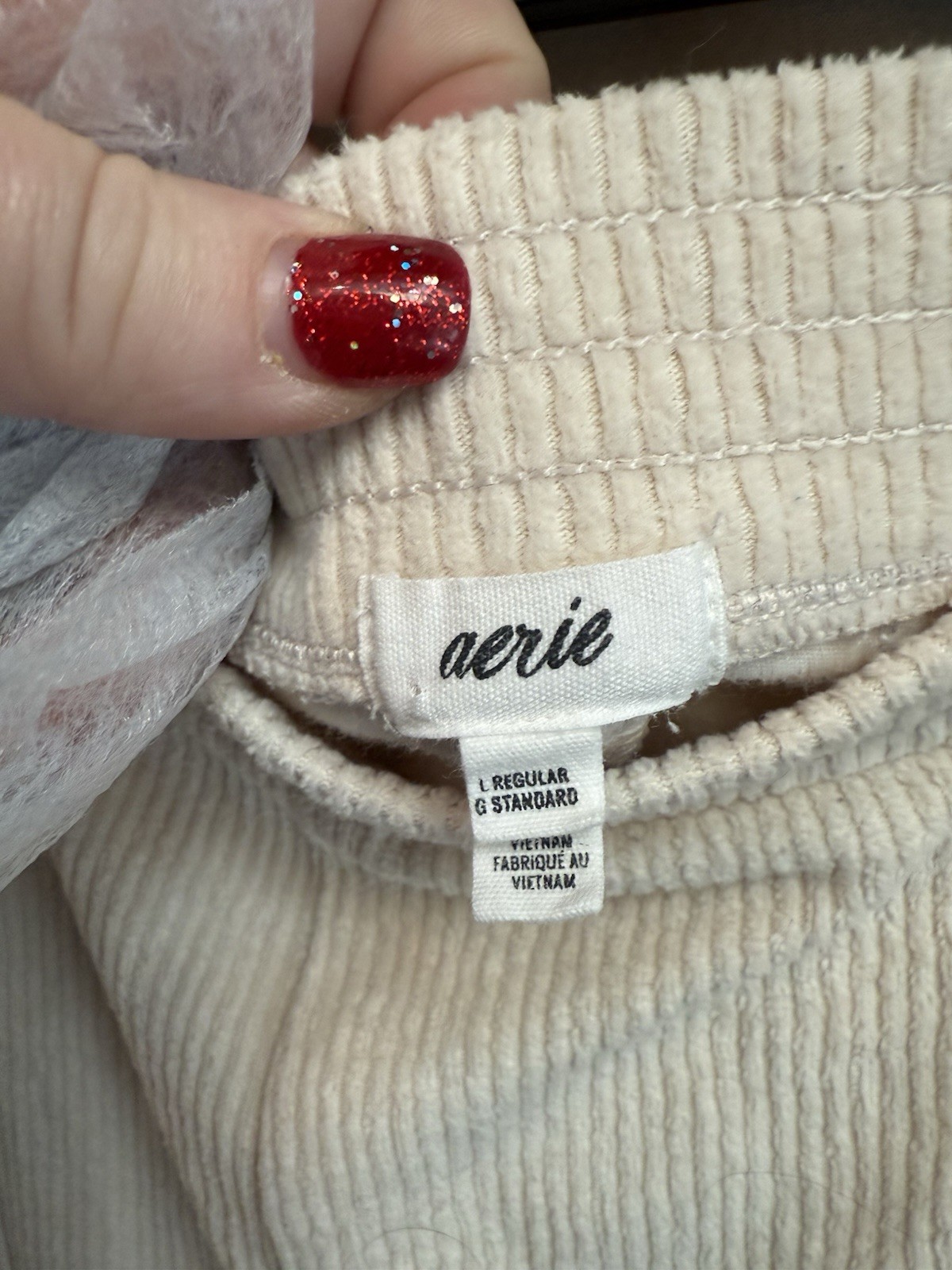 These Aerie corduroy flare pants in size Large are perfect for casual occasions during the fall and spring seasons. The ivory color and cotton blend material make them versatile for styling. With an elastic waist for comfort and a high rise, these pants offer a flattering and relaxed fit. Easy to care for with machine washable fabric, they are a stylish addition to any woman's wardrobe.