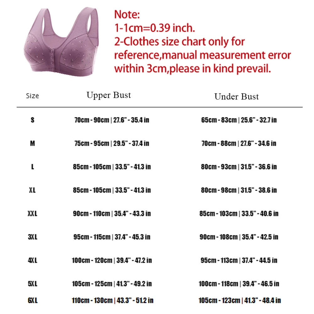 Features: 【 Front Closure Bras for Women】Experience exceptional support and comfort with our Front Closure Bras. The innovative design features 3D seamed cups, wide side , cushioned shoulder straps, and a U-shaped back panel to sagging, smooth back bulges, and correct armpit concerns. 【Comfort Compare】 Crafted from a blend of microfiber and elastane, our sweat-wicking fabric delivers flexibility, durability, and day-long comfort. You'll forget you're even wearing it, thanks to its silky-soft. 【 Posture-Enhancing Design】The front buckle makes wearing and removing this bra a . Wire- thin cups provide the perfect blend of support and comfort, promoting a natural bust shape without poking underwires. Plus, it encourages posture by evenly distributing weight across your shoulders and back. 【 Versatile Support】Suitable for women of all ages, including young women, pregnant or breastfeeding mothers, and those seeking indoor or outdoor support. This versatile bra is designed to cater to your specific needs. 【 Sleep in Comfort】Our Front Closure Bras aren't just for daytime wear; they double as supportive sleepwear. Enjoy a comfortable night's rest with this multi-functional lingerie piece. Material:Cotton Polyester Size:36/80BC,38/85BC,40/90BC,42/95BC,44/100BC,46/105BC,48/110BC,50/115BC,52/120BC Color: As picture shown Wash the water below 30 C with warm water and do not bleach Note: 1. For reasons of taking pictures, please allow slight color differences 2. This bra is smaller than the regular size. We recommend that you choose a bigger one. For example, if you wear size 38BC, you should choose size 40BC Due to the light and screen setting difference, the item's color may be slightly different from the pictures. Please allow slight dimension difference due to different manual measurement. Package Includes:1 x Women Bras