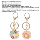 Feature: 1. The cute key chain is equipped with a key ring and hook, which can hold various door keys, car keys, safe keys, etc. 2. It can also be used as special car keychains, backpack pendants, handbag pendants, wallet decorations and car interior pendants. 3. This keychain can be used not only as a keychain in daily life, but also as a fashion accessory. It is very suitable as a Mother's Day gift, Christmas gift, birthday gift to girls, friends, lovers and mothers. 4. Polished to create a comfortable wearing feel, the surface treatment is smooth and delicate, and there will be no discomfort of scratching when wearing. 5. Use high‑quality zinc alloys, which have better toughness and strength, and are not easy to fade. Use different methods to set them with . Specification: Item Type: Key Chain Material: Zinc Alloy (composed of complex materials) Length: Approx.10.5cm/4.13in Package List: 1 x Key Chain Note: Manual measurement, there may be a little error, please understand