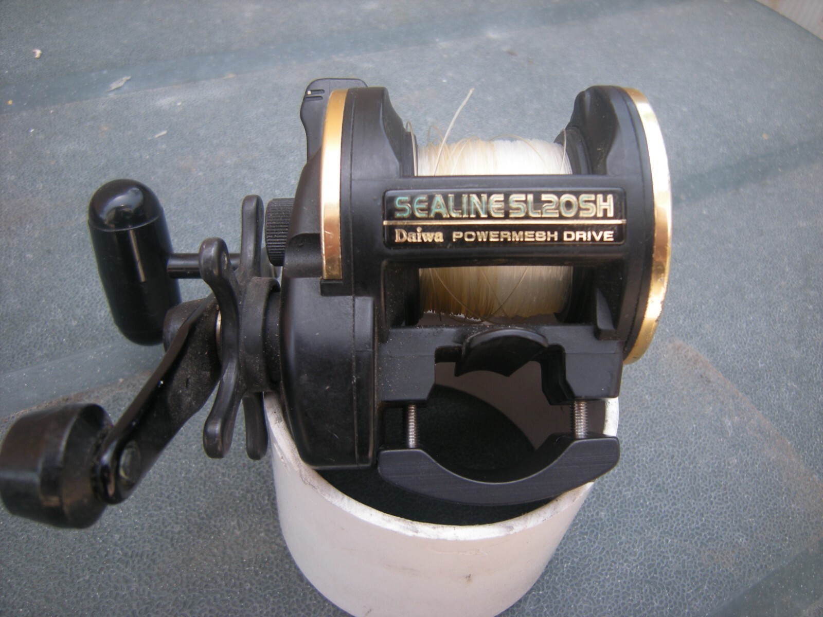 Selling a used Daiwa Sealine SL20SH fishing reel. long cast spool. Nice graphics - This reel is well functioning, cosmetically good all around. 1) Gold plated side rings look decent, left rungs has minor contact flaws. 2) Original clamp and hardware. 3) Spooled with 20# Trilene. 4) Functions like new and frame decaling looks great. This reel casts great and has a smooth drag system. Applications for surface fishing - bass, barracuda, halibut., yellowtail. Works extremely well for casting 'chovies and 'dines. Spool spins like crazy. Redeeming Features: Free-Floating Spool-Speed Shaft separates the spool from the gear train on outcast for less friction, longer casts and faster lure drop. Three CRBB Super Corrosion Resistant Ball Bearings. Massive, six-element sealed drag, ultra-smooth and consistent. Tough marine bronze and stainless steel gears. High-tensile aluminum spool, super-strong yet super light in weight. Two-position power handle, Rod clamp and 30# Trilene mono included.