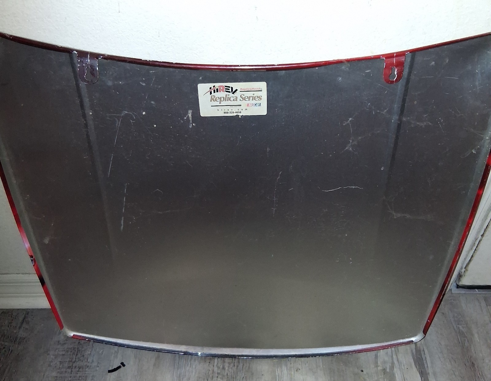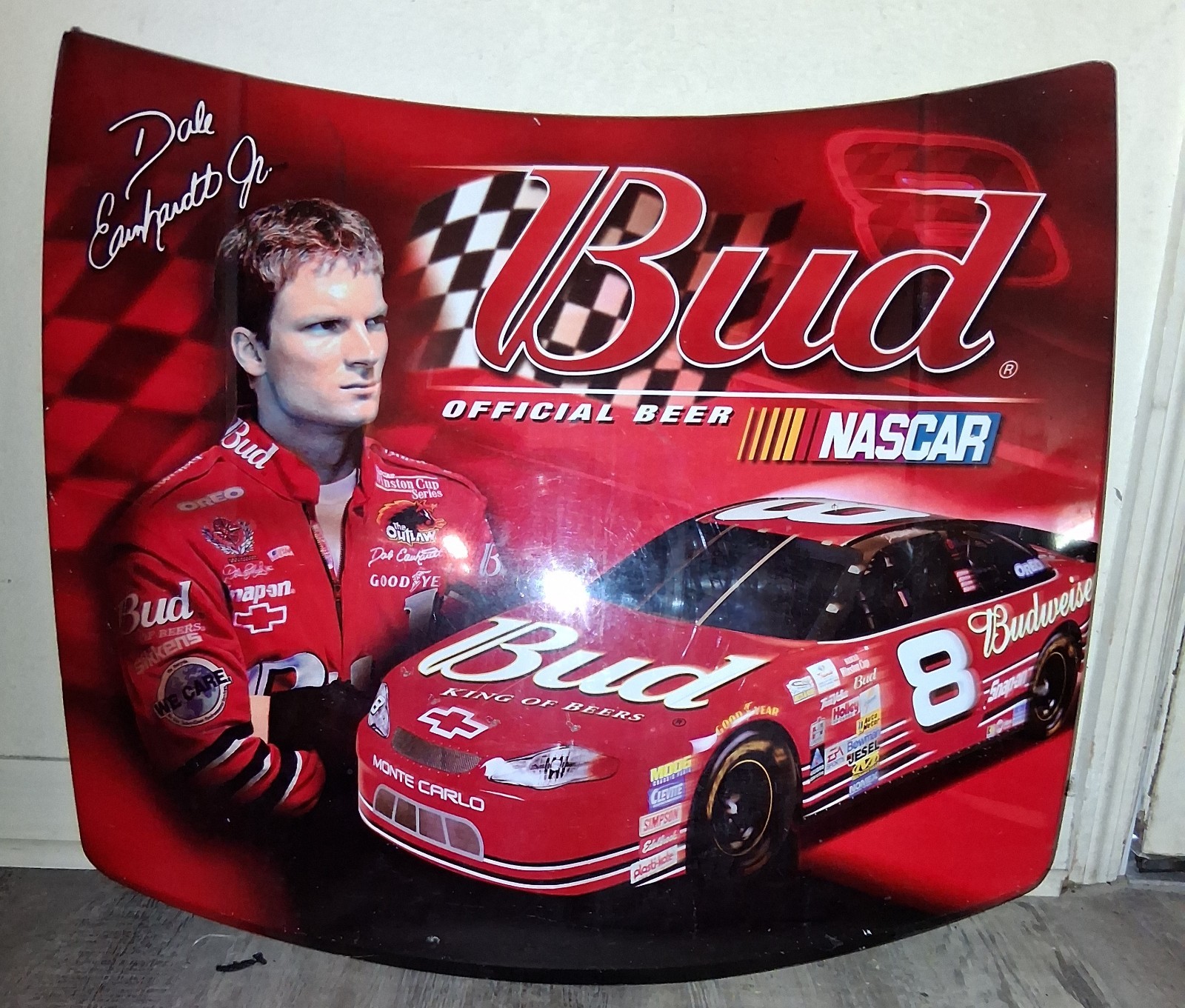 The product is a replica NASCAR car mini hood featuring Dale Earnhardt Jr. #8 Budweiser HiRev design. It is officially licensed by NASCAR and showcases the racing team of Hendrick Motorsports. The multi-color car is a sign suitable for unisex adults who are fans of auto racing and specifically Dale Earnhardt Jr. aprox 1.5'x2 5'