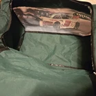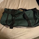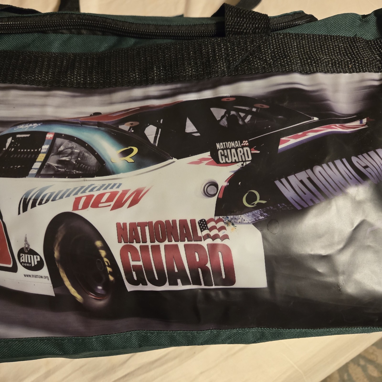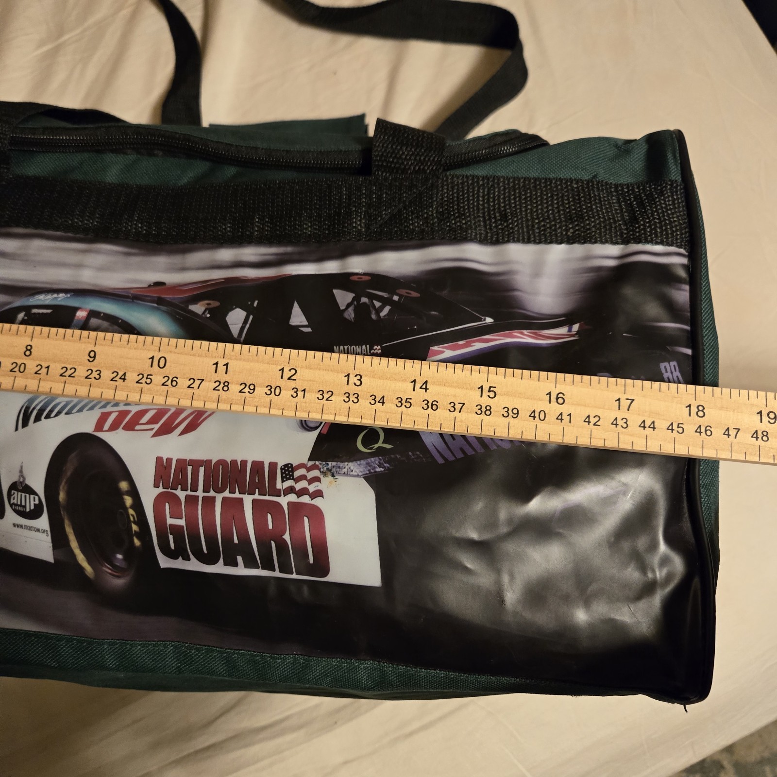 The product is a green duffel bag featuring the racing number #88 driven by Dale Earnhardt Jr. in NASCAR. This officially licensed merchandise is perfect for fans of NASCAR looking to show their support for one of the sport's most popular drivers. Ideal for transporting sports gear, luggage, or any other items while representing their favorite driver and league.