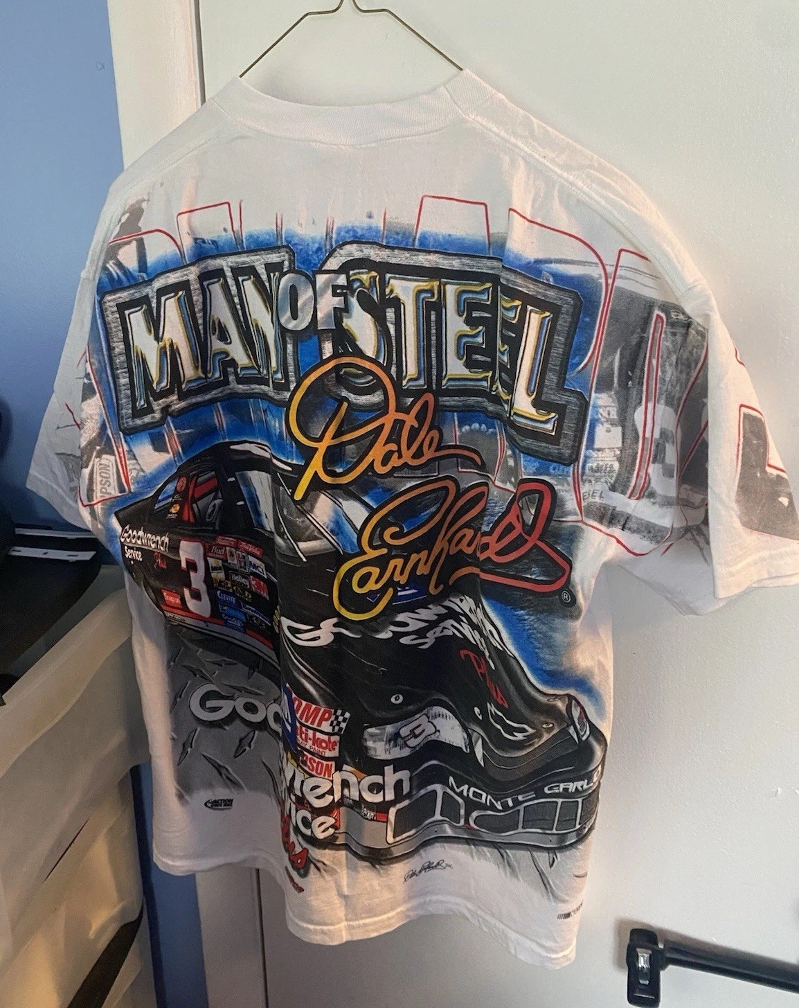 The product is a vintage Dale Earnhardt Jr. men's medium t-shirt featuring an all-over print of Budweiser branding, perfect for fans of NASCAR racing. Officially licensed by Chase, this shirt showcases the popular auto racing driver and brand in a classic white color. Perfect for any male fan of Dale Earnhardt Jr. or NASCAR, this shirt is a stylish and nostalgic addition to any wardrobe.
