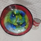 Dale Tiffany Hankley 12" large hand blown glass dish is very versatile and can be used as a display, fruit bowl, secured at base as wall décor. Slightly curved edges, dark blue and green blending, thick red band around edge with black trim. Has a 1" glass base. I have multiple Dale Tiffany dishes in various sizes. You can use a variety of them to create a stunning, artistic wall mural. Soup can is pictured to show size and dimension. Measures 12 inches across and 2.5 inches at the highest part of the curved edge. Like new condition. Never used & label still on the base. You can use a variety of them to create a stunning, artistic wall mural by buying wall brackets at your local home improvement store - brackets not included - example in last pic. Nonsmoking home with awesome pugs.