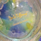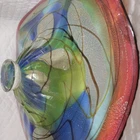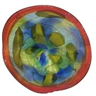 Dale Tiffany 20" Hankley, large hand blown glass dish is very versatile and can be used as an art display, plate platter fruit bowl, or can be secured at base as wall décor. Slightly curved edges, light green and olive colored swirls with blue mixed in, thin red band and black trim. Has a 1" glass base. I have multiple Dale Tiffany dishes in various sizes. You can use a variety of them to create a stunning, artistic wall mural with wall brackets that are not included but can be found at home improvement stores. Soup can is pictured to show size and dimension. Measures 20.5 inches across and 4 inches at the highest part of the curved edge. Like new condition. Never used & label still on the base. Nonsmoking home with awesome pugs.