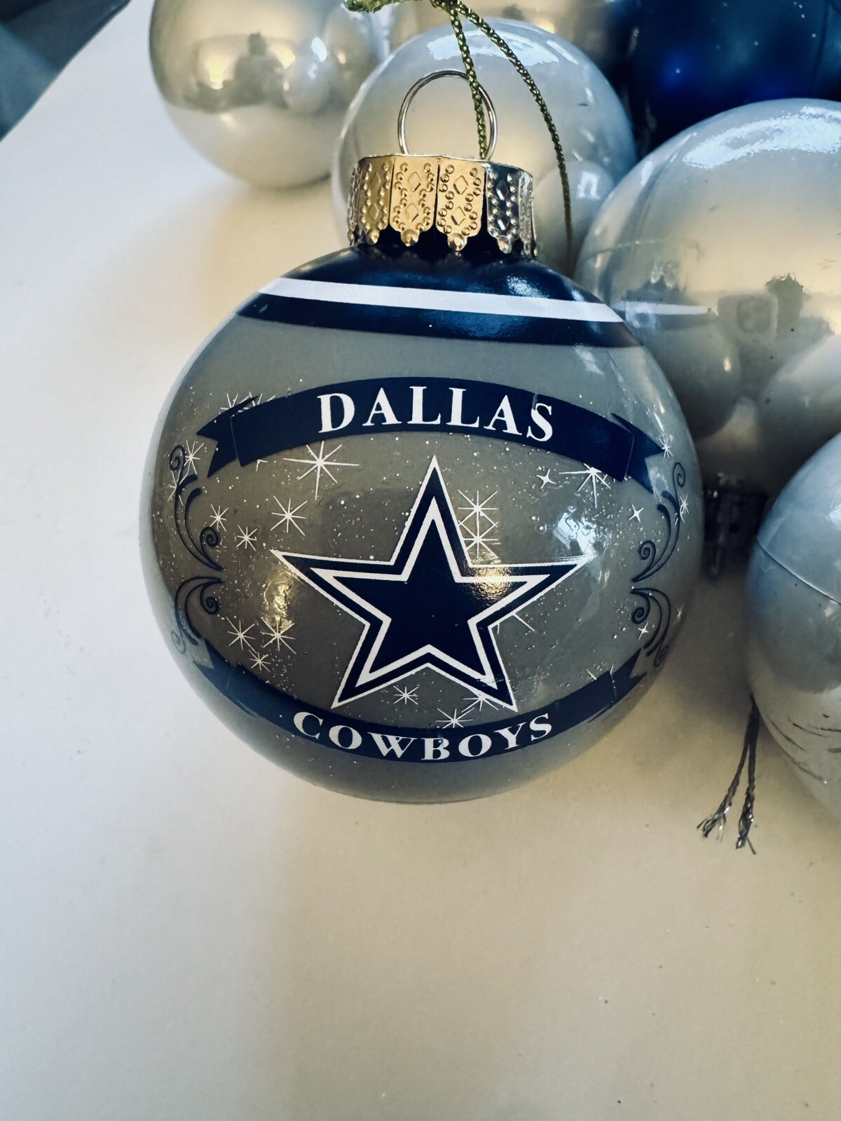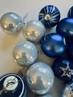 Get into the holiday spirit with this Dallas Cowboys Christmas tree ornament set! The set includes a beautiful ornament featuring the team's colors and logo, perfect for any fan's tree. Additionally, the set comes with a Christmas tree skirt to add a festive touch to your decorations. This set includes: - 12 gray & navy blue Dallas cowboys small ornaments - 1 large Dallas cowboy ornament - 28 assortments of regular (NOT Dallas cowboys) medium ornaments - 1 dark brown, Horseshoe and Star Christmas Ornament - 1 Christmas Tree Skirt Blue Snowflakes Christmas Tree Skirt for Xmas Holiday Party Home Decoration 36 Inch Celebrate the season with this unisex set, perfect for any football fan. The multi-team colors and league-specific design make this a great addition to any collection. Add some team spirit to your holiday decorations with this Dallas Cowboys ornament set! Returns: item has to be returned in same condition for full refund.
